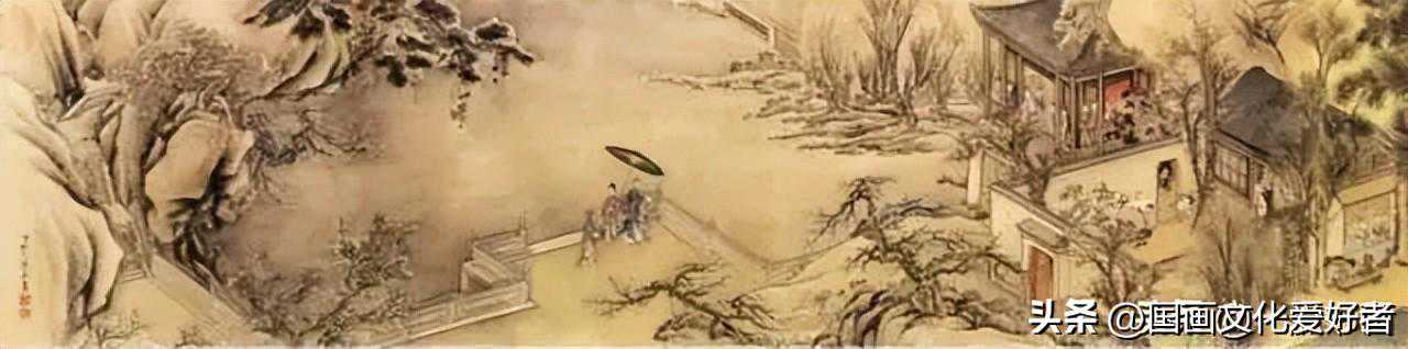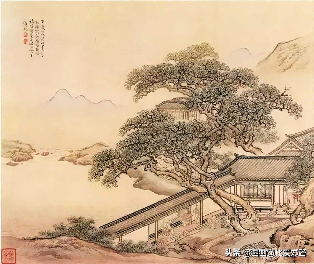 袁耀,生卒年不详,清代画家。字昭道,江都(今江苏扬州)人。袁江之侄,一说袁江之子。工画山水、楼阁、界画。画风工整、华丽,与袁江相似,其精品有胜于袁江者。花鸟亦佳。存世作品有《骊山避暑十二景》《阿房宫图》等。约活动于乾隆中期。所选两页分别为《百岁旧人谈旧事》和《农户小桥》,前者画四株参天古树,偃卧横枝,探出廊亭檐外。远山一抹,显出水面之深远。亭内,两百岁老者对坐而谈,一童子侍立旁侧,一童子庭内煮茶,别具情致。后幅写农家生活,阁楼依山傍树而建,形成一座小院,院内院外,人物动作栩栩如生,不远处的小桥上,有人背负重物而行,充满了生活气息。