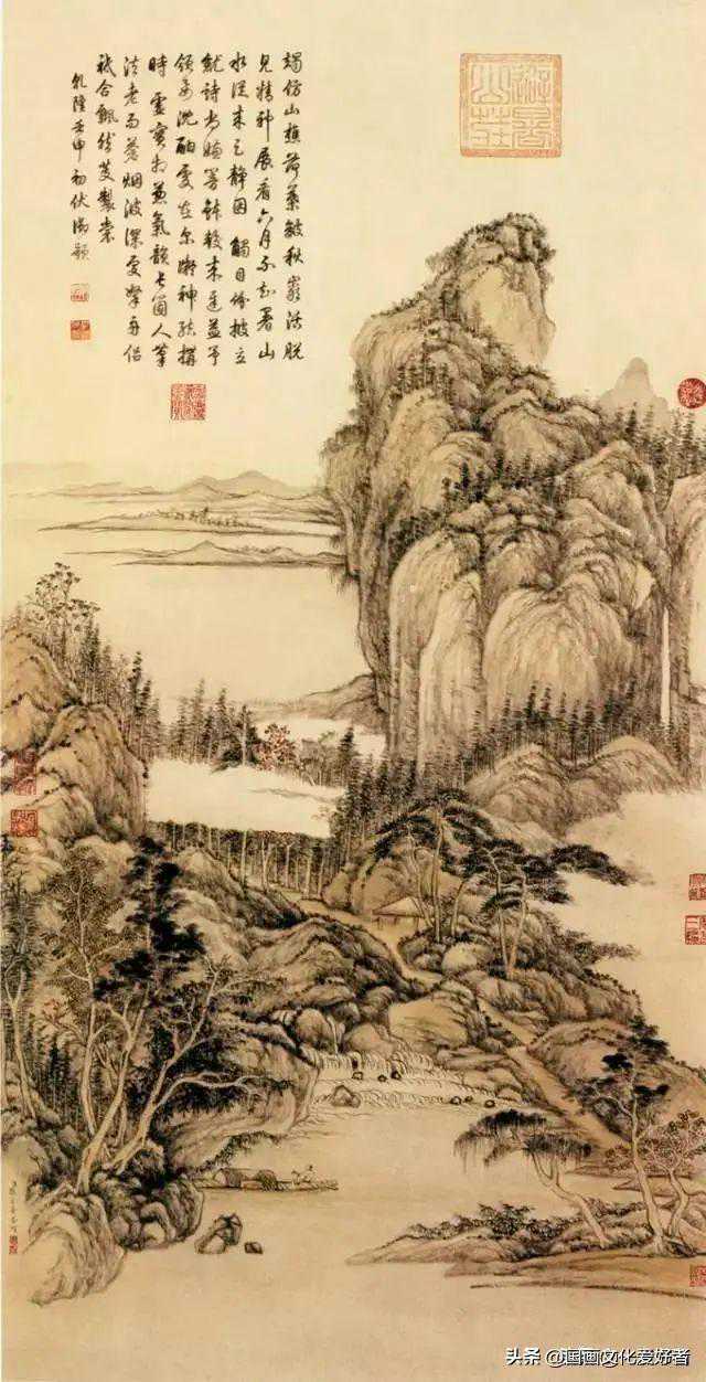 此图画重峦叠嶂,丛树密林,山溪汇合,沿溪树林间舍人家掩映其中。布置精心,境界幽旷,笔墨苍劲。