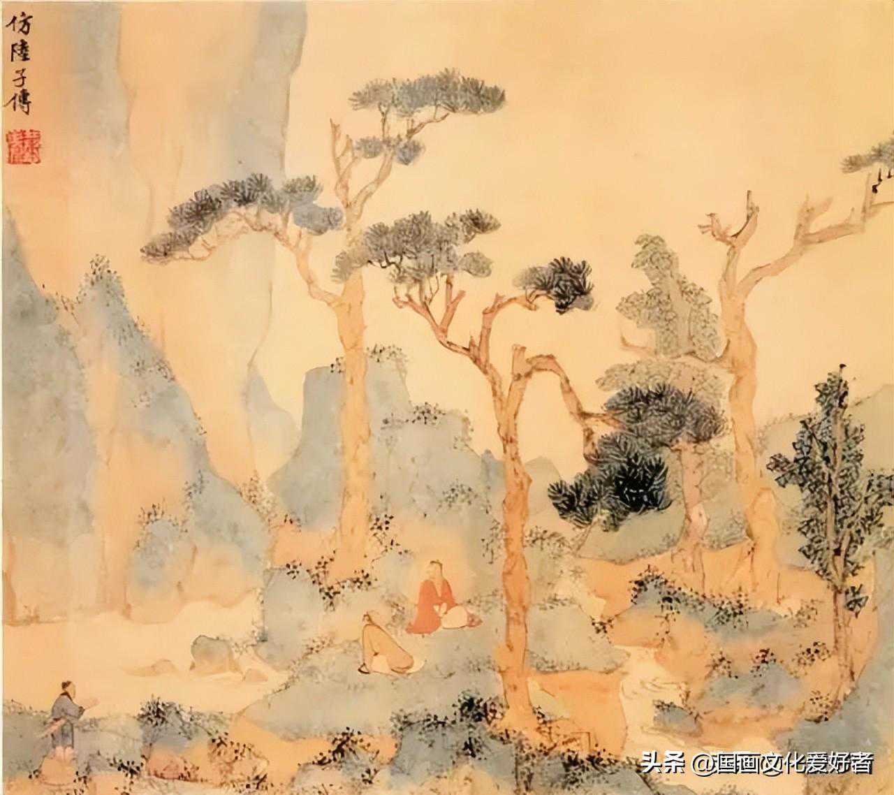 潘恭寿(1741—1794),清代画家。字镇夫,号莲巢,江苏镇江人。能诗善画。少学山水,苦无师承,王文治遂授以书家用笔之道。恭寿复取古迹临仿,画乃益进。山水规仿文徵明,花卉取法恽寿平,画佛像及仕女,亦韵秀而饶古意,竹石亦佳。传世作品有《江帆远岫图》《烟云阁图》《写柳永词意图》《仿戴逵破琴图》。此所选其中一页《仿陆子传》,画山石壁立,层峦叠翠,平缓处,老树横枝,其下,溪流有声,绿草丛茵,两高士席地而坐,欣赏周围美景,童子则抱琴侧畔待唤,各自神形俱备。画面苍古隽逸。