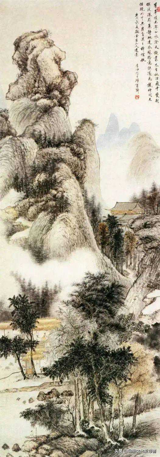 此幅画法似出自元代王蒙,皴笔粗细繁疏,水墨浓淡燥湿,皆能脱尽笔踪而备极变化;再略施浅彩,画面呈现出一片光影清明柔美的景色。造景尤其诡奇奥妙,缅邈幽深,出人意料,而又能不失真山实水的面貌,令观者目驰神往,堪称佳作。