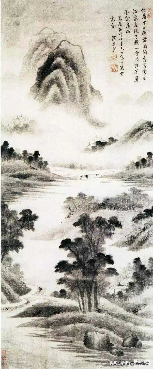 孙克弘(1533—1611),字允执,号雪居,华亭(今上海松江)人。曾官汉阳太守。工诗文,能书法,绘画人物、山水、花鸟无所不精。图中画远山雾霭,近树清波,板桥屋舍,点缀其中。用笔圆润,墨色浑厚,表现了春天的雨后景色。此图自题诗云:“僧房十日掩紫关,闲看浮云自往还,无限天机心会得,起来磨墨写房山。”全幅诗情画意,皆含仿米之意。