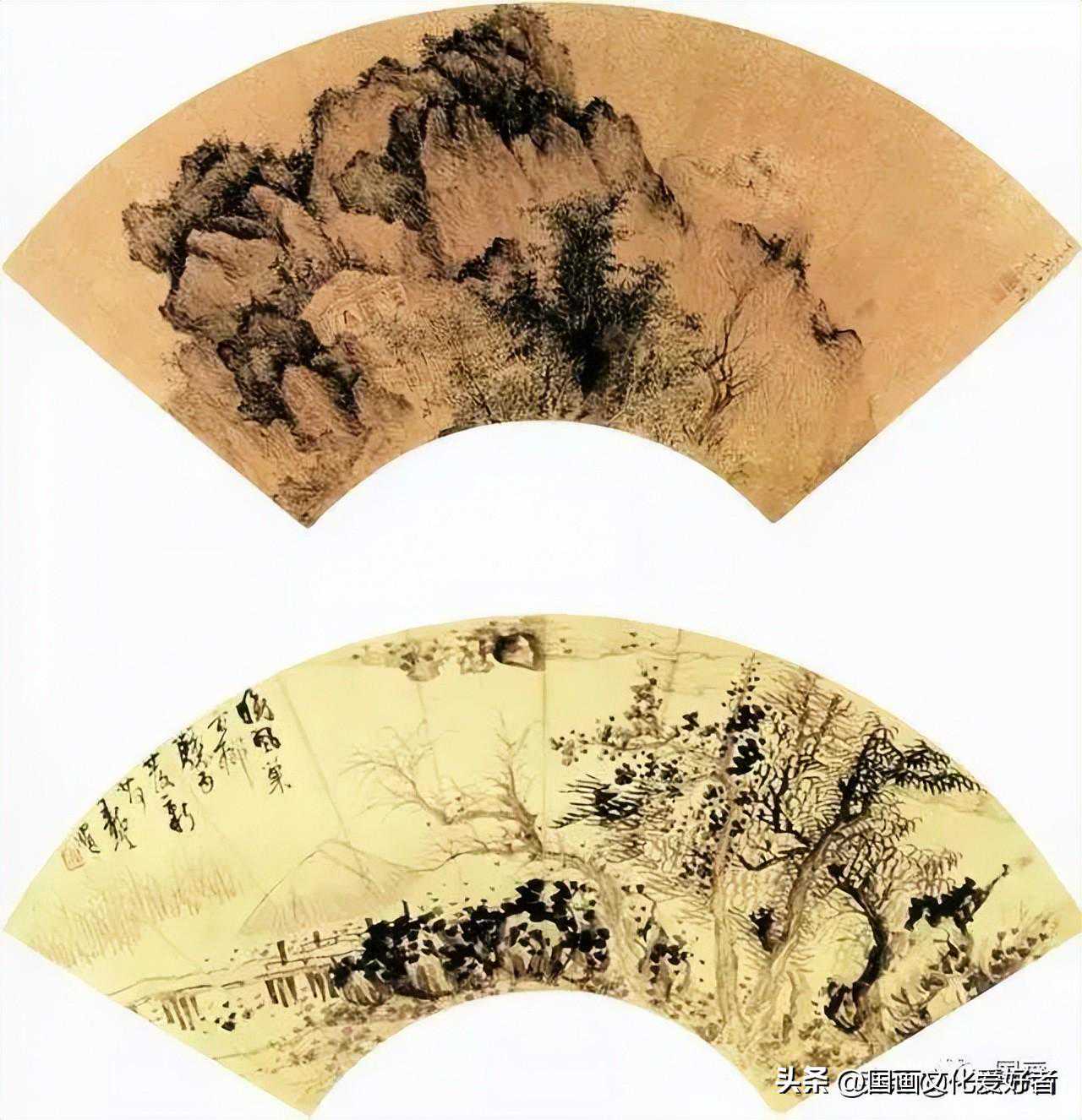 此两幅山水扇面图,当是作者清雅隽逸、古秀峭劲之作,画家借鉴南宋“半边”“一角”式的构图方式,画得格外空旷虚淡。尤其是两幅近景中树的画法,既有横点叶、直点叶,也有双勾圆点叶、圆笔疏点叶,它们高低参差,掩映得势,浓淡互照,绝无雷同,乃全局的得意之笔。至于茅棚屋舍、小桥溪水,则更是平添风韵之致。