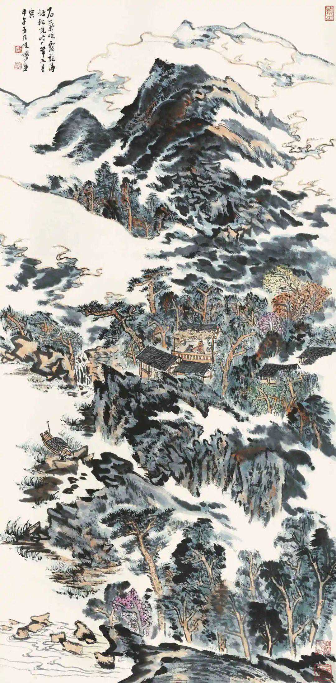 款识:石气晚霞笼薄赭,松光寒翠入青冥。甲子五月,陆俨少画。