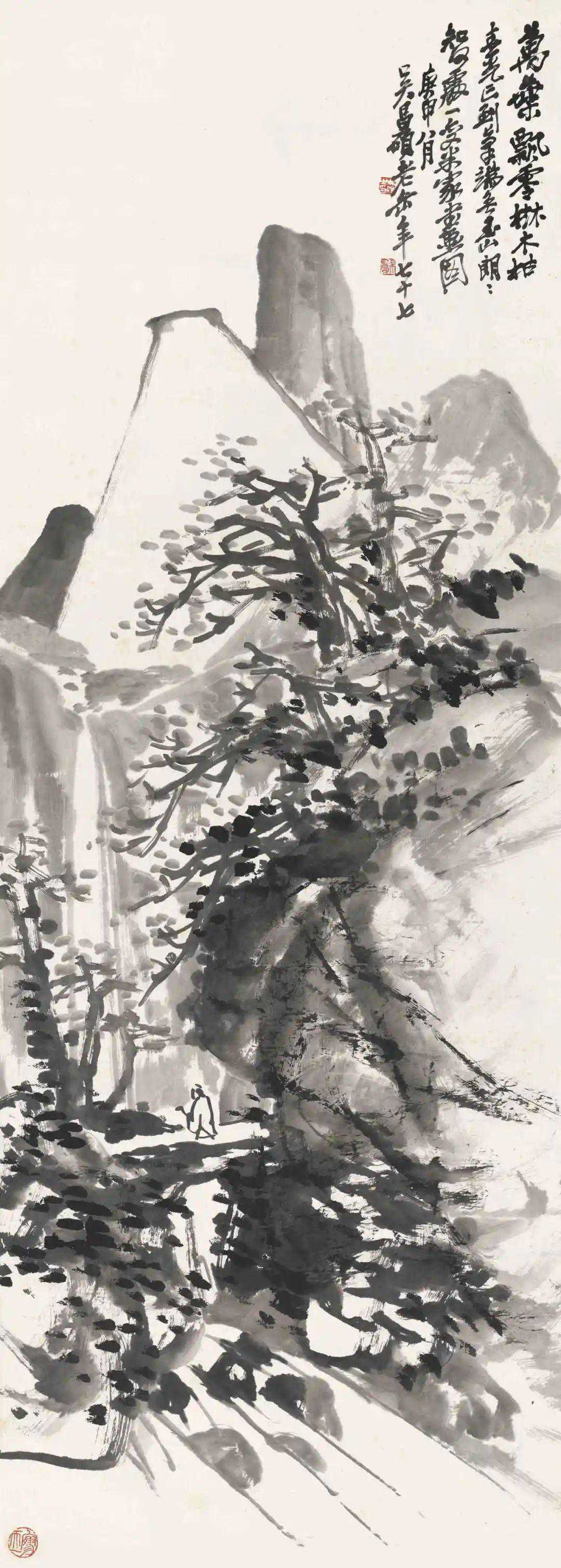 款识:万叶飘零树木枯,春光已到笔端无。玉山朗朗千人见,一变米家水墨图。庚申八月吴昌硕老缶年七十七。