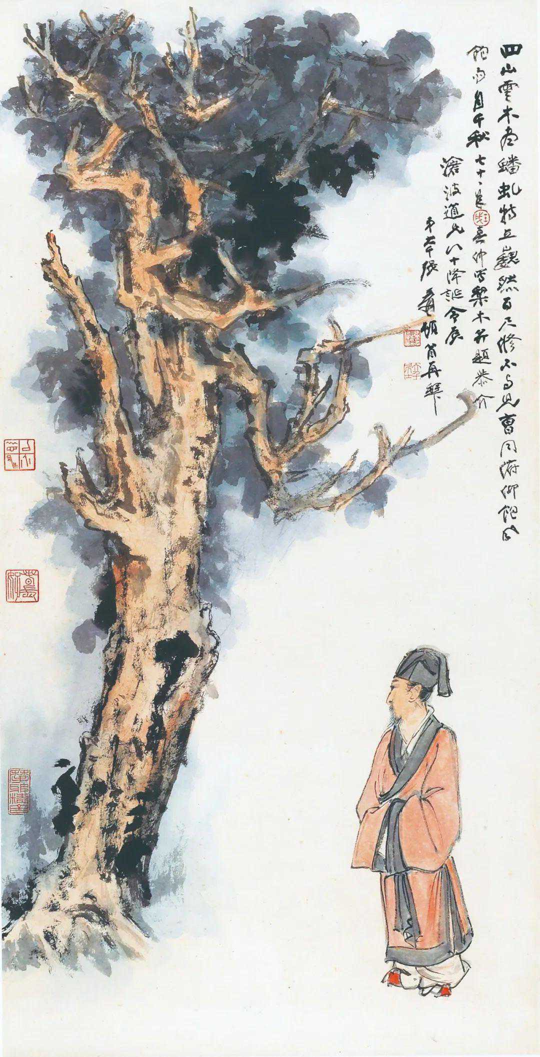 款识:四山云木尽蟠虬,特立巍然百尺修。不与儿曹同俯仰,饱风饱雨自千秋。七十一年春仲写梨木并题恭介。沧波道兄八十降诞令辰。弟大千张爰顿首再拜。