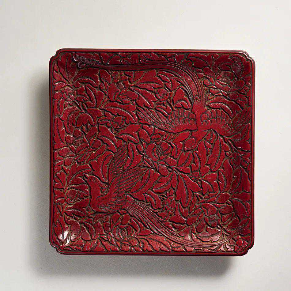 明或更早剔红牡丹绶带纹倭角方盘