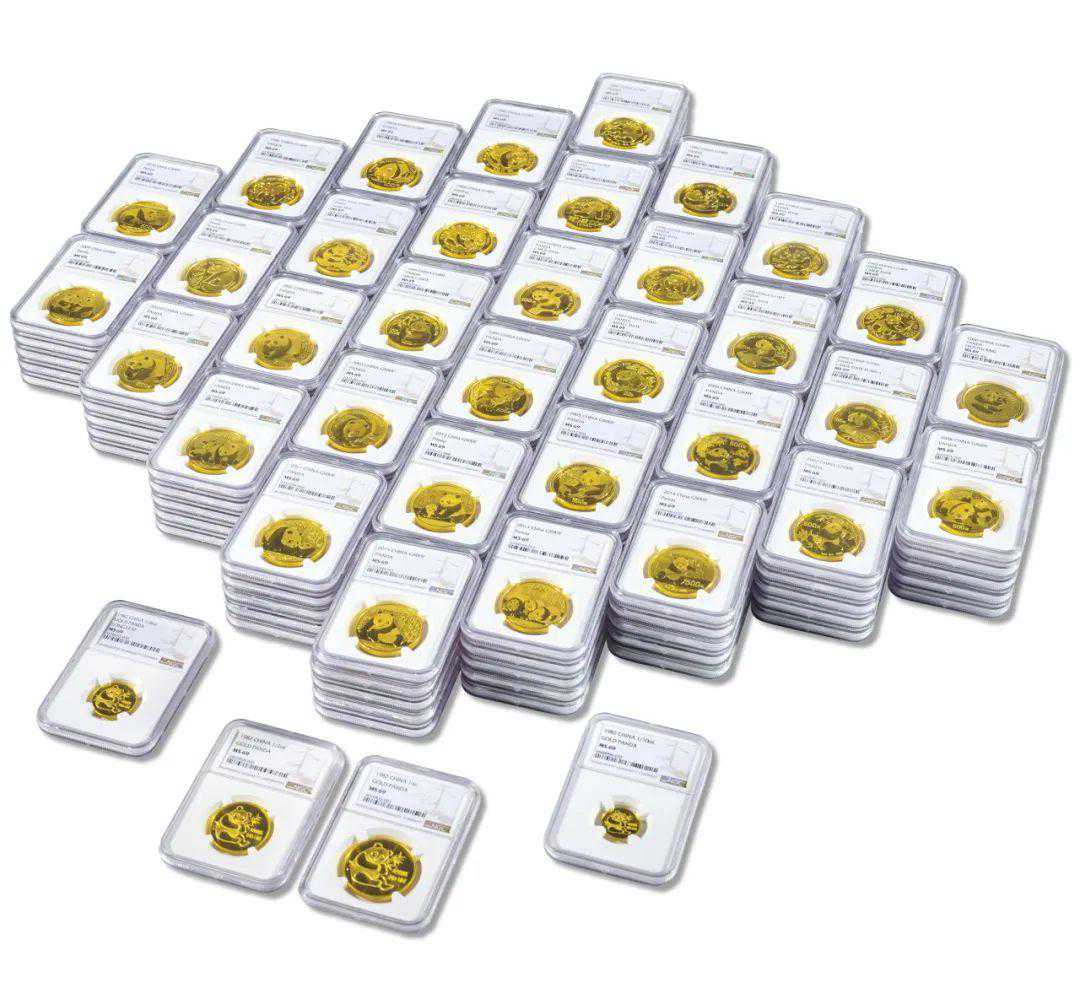熊猫金币大全套共有金币174枚,均NGC評级MS69-70。金币按照发行惯例每年共有五种规格,分别是:1/20盎司、1/10盎司、1/4盎司、1/2盎司、1盎司,成色均为:99.9%仅1982版熊猫币是唯一一套没标面值且只有四种规格。