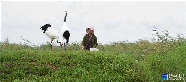 这是徐秀娟与湿地中的鹤(资料照片)。新华社发