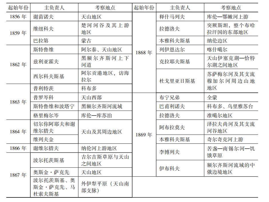 表1俄国地理学会1851~1869年间主要中国西北边疆考察活动一览表[12]