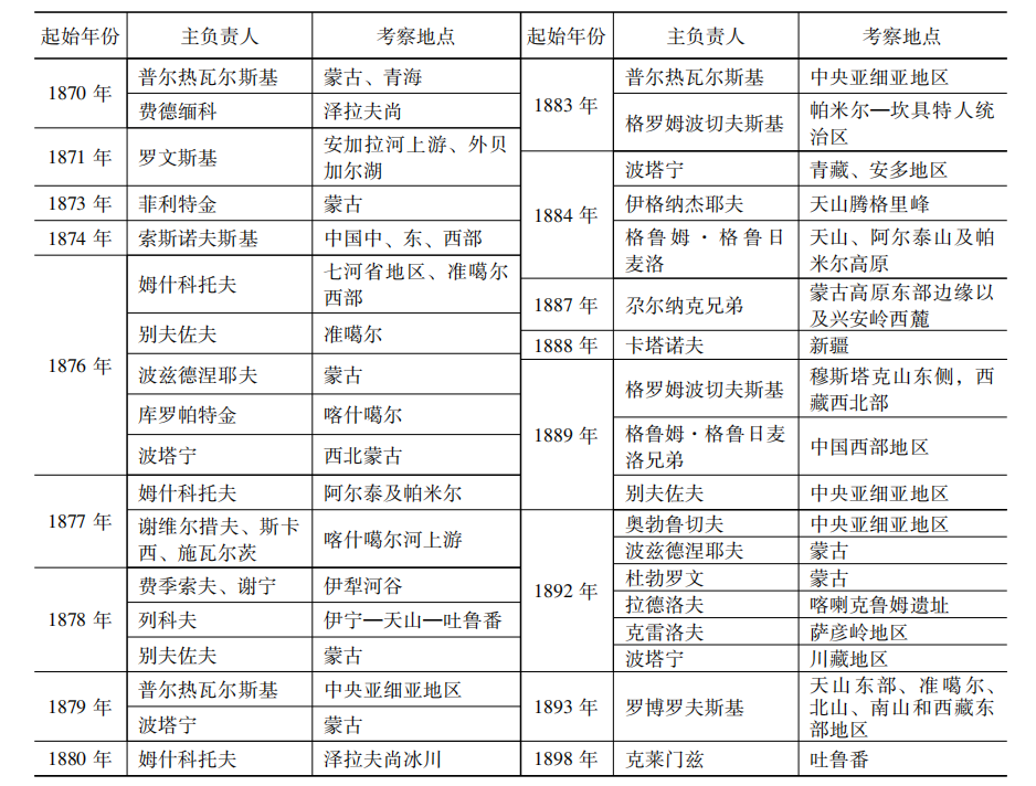 表2俄国地理学会1870~1898年间主要中国西北边疆地区考察一览表