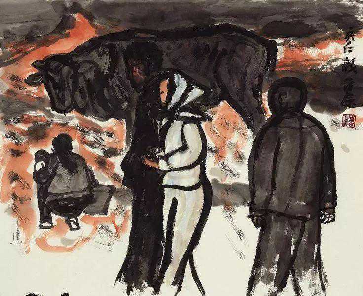 明白了这个道理,我慢慢读懂了先生作品意境之皮毛。在先生很多的画中,如《大贵》《米脂》《西川》《柳林》,女性没有眉眼,男性也只有一个侧影,画面的结构、造型、笔墨十分简单,然而,即便就是这样一个背影或轮廓,这样一个随手拈来的皴画点染,在看似平淡无奇中,艺术的张力却瞬间爆发,直抵内心深处的柔软,一瞥之下让人难忘。