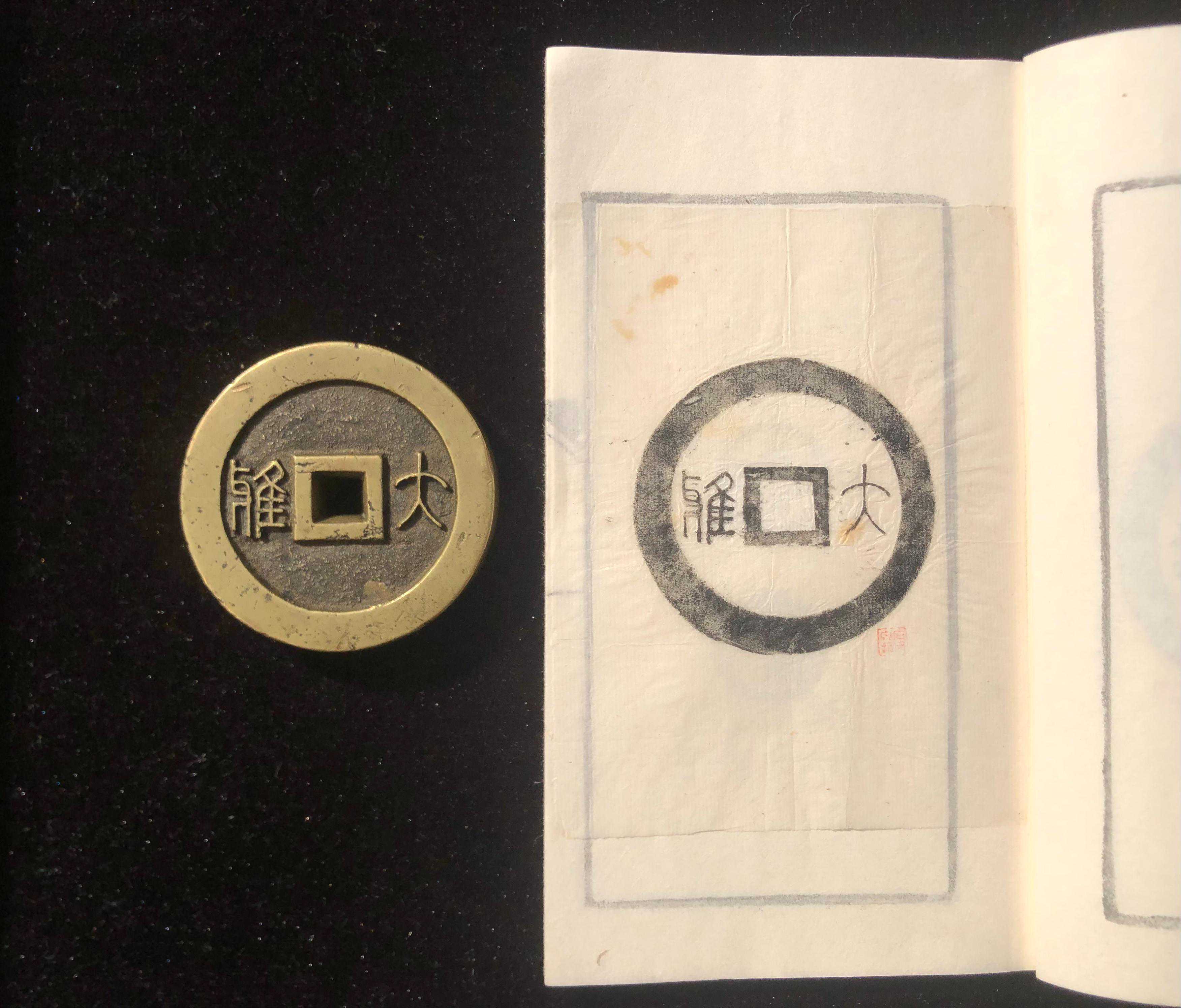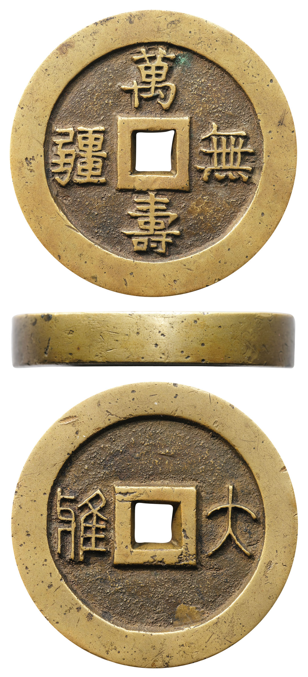 说明:附拓片一本。本品为天津钱币收藏家唐石父先生最为珍爱之品,配有亲笔书写及亲拓“万寿无疆”拓片集,其中所拓都为最喜欢之物,而本品面文用做拓片集的名称更显示其在老藏家心中的重要地位。