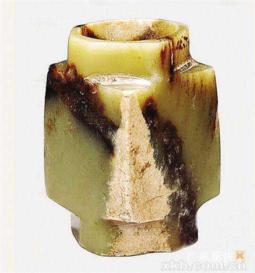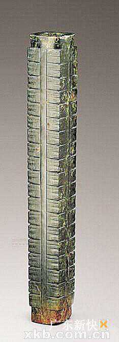 河南安阳殷墟妇好墓出土。此器方形柱体,中心呈圆筒状,方柱四角两侧面均阴刻粗细不同的纵向弦纹,圆筒上下两端阴刻多道平行弦纹。