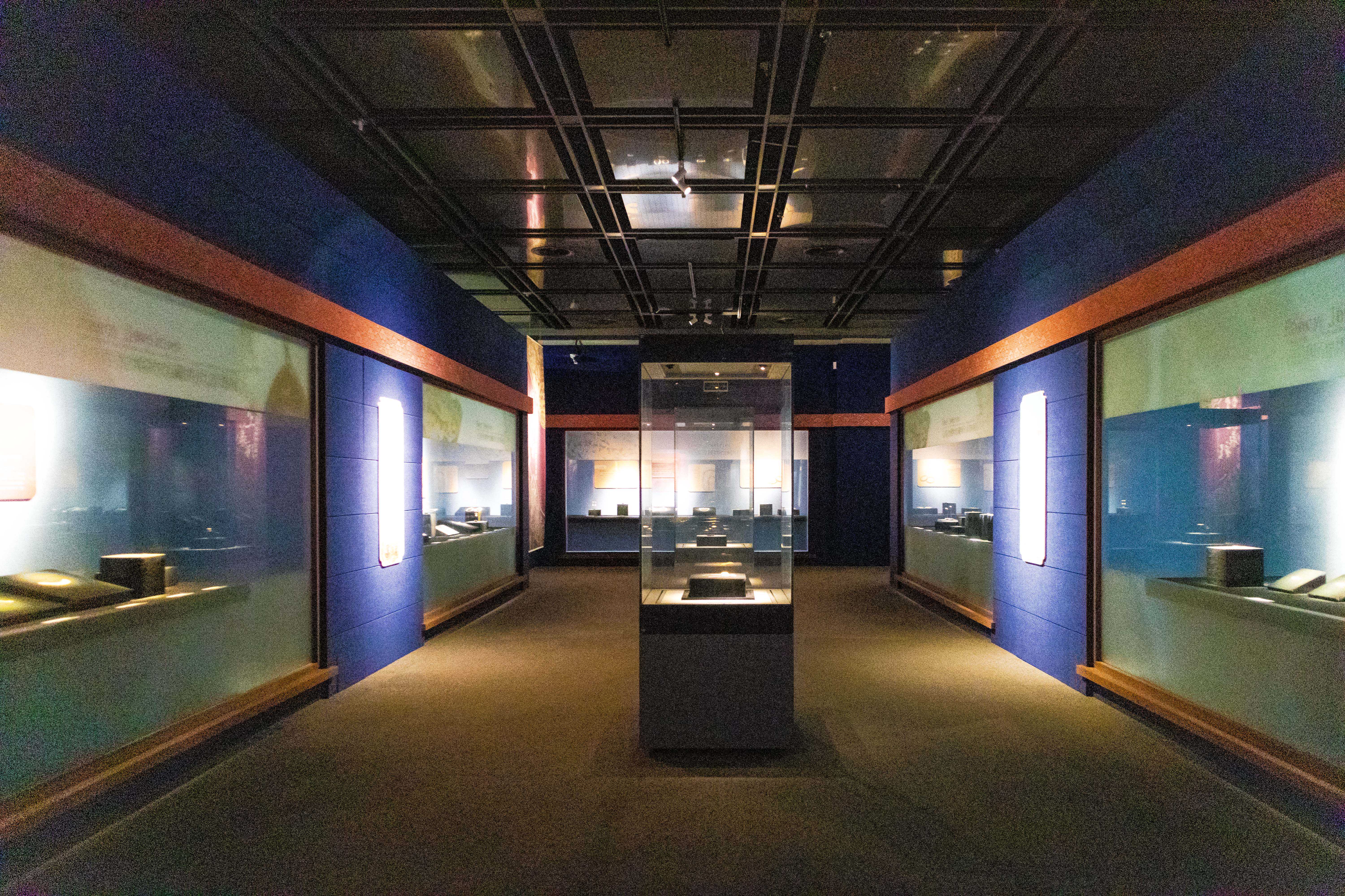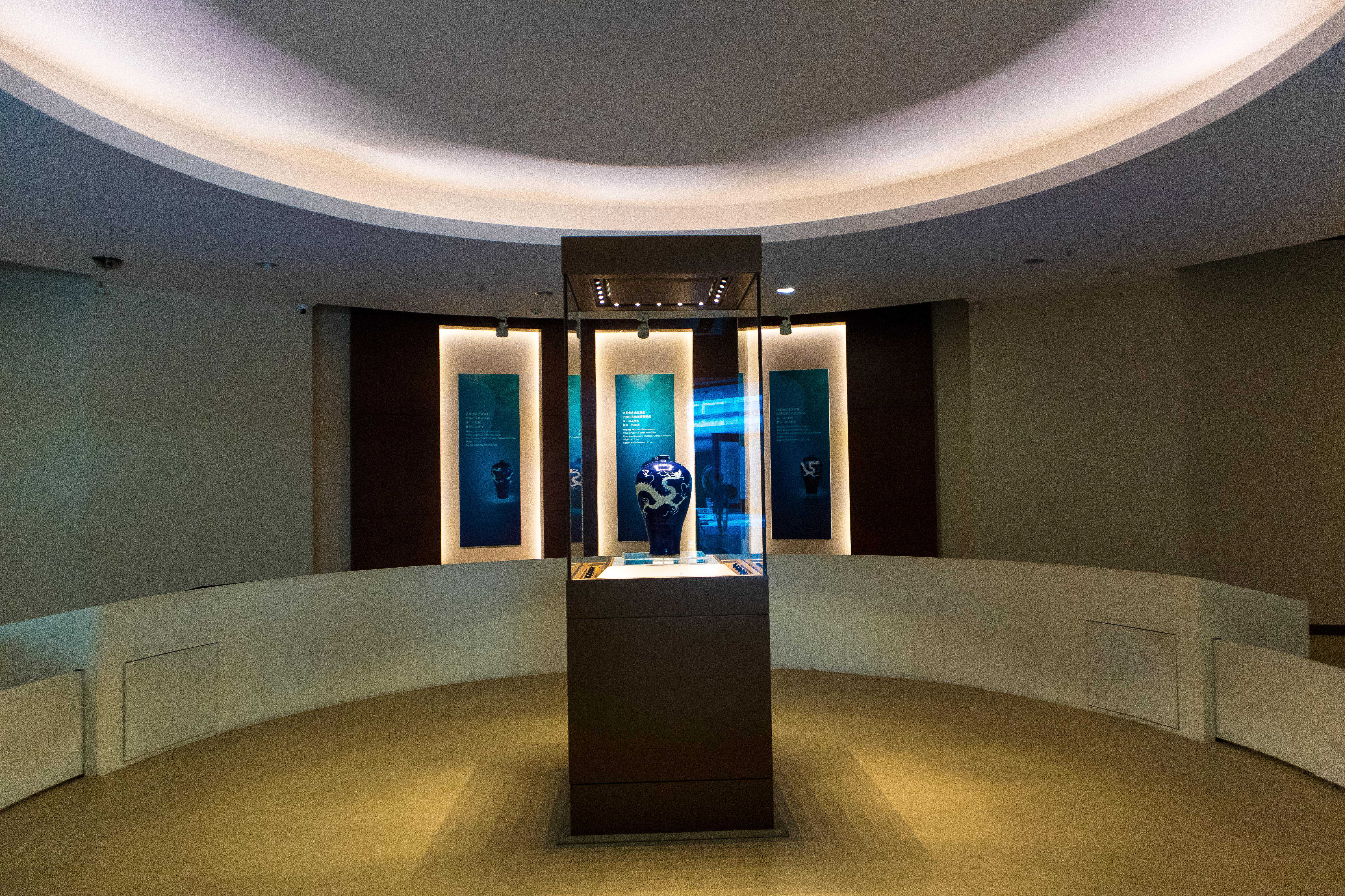 来到这里必不可错过的一个展厅,那就是国宝厅,这也是我在等朋友的时候偶然看到的一个展厅,不然可就错过了。如名字而言这里展示的是博物馆的镇馆之宝,他是国宝级的文物珍品,展品为元代霁蓝釉白龙纹梅瓶。