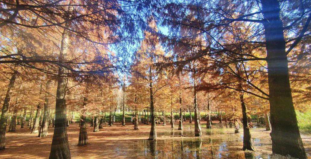 6.海洪湿地公园,一个充满自然美景让人心旷神怡的地方,特别是秋天的时候,乘坐透明船穿梭在红色的水杉林中,简直不要太梦幻。