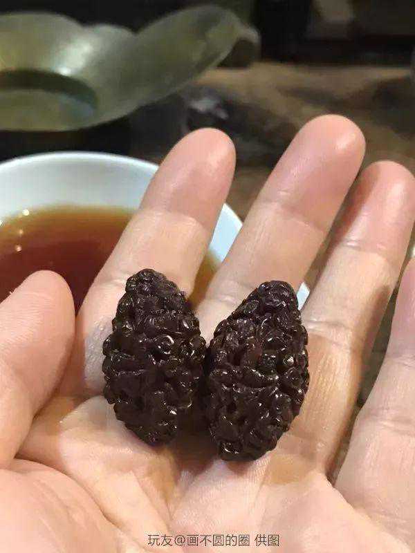 玩友@画不圆的圈平时喜欢收一些老货。这橄榄核只有两颗,平时用来搭配串儿,收来的时候,开始包浆是红色,玩到现在,颜色竟有些变紫色了!
