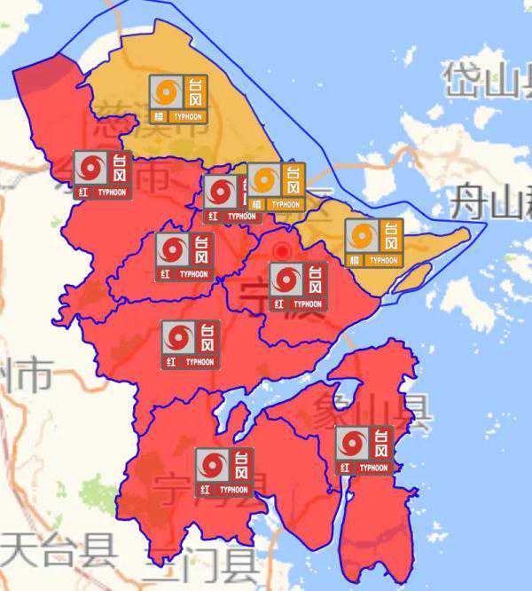 市气象台消息,截至13日11时,宁波市海曙区、江北区、鄞州区、奉化区、余姚市、宁海县、象山县将台风橙色预警信号升级为台风红色预警信号,其他各区县市继续发布台风橙色预警信号。