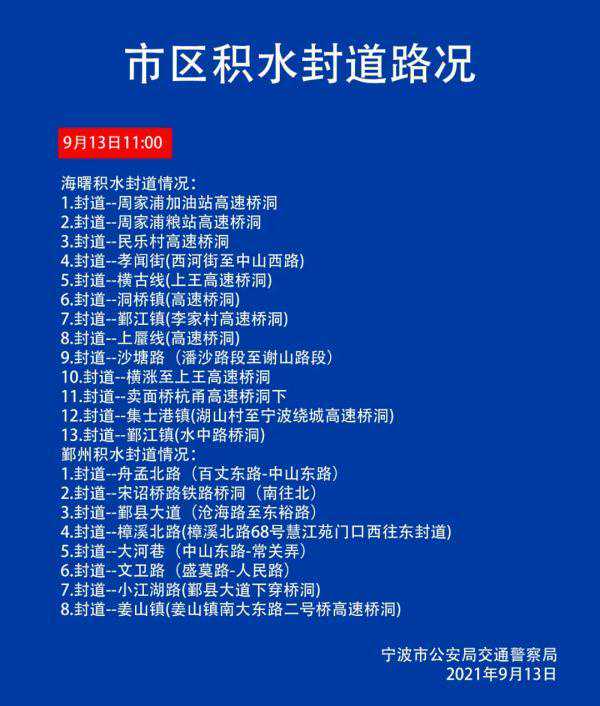 89路:因院士路中石化宁波工程公司路段积水封道,临时双向改走扬帆路,取消扬帆路、院士路、江南路部分路段运营,取消扬帆广场西、中石化宁波工程有限公司、颐乐园停靠站。