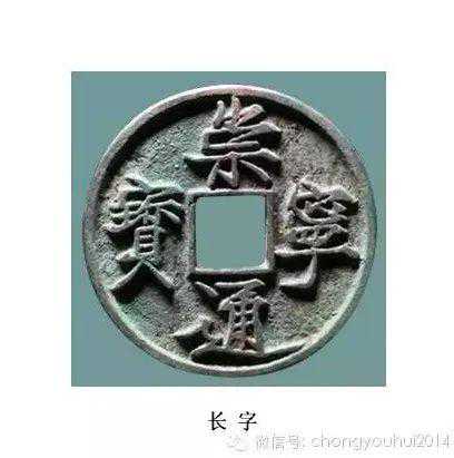 长字,崇宁通宝中的一个主要类别,钱文舒展张扬,用笔锋芒毕露,字形稍大。