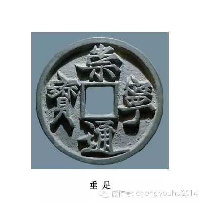 垂足,崇宁通宝中以宝字命名的一个类别,书法刚劲有力,宝足狭长,最后一捺收笔似垂露。
