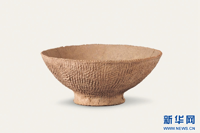 绳纹红陶圈足碗,秦安县大地湾遗址出土,口径18厘米。大地湾文化是黄河流域最早产生陶器的古文化之一。陶质多为夹细砂红陶,以陶器器表印有交叉绳纹为特征。八千年前出现的圈足碗的样式,至今仍被沿用。