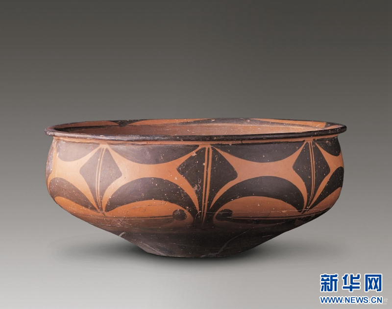 弧边三角纹彩陶盆,仰韶文化庙底沟类型(距今5500年前),秦安县大地湾遗址出土,高16.4厘米,口径39厘米,底径13.2厘米。器上施橙黄色陶衣,腹部以黑色彩绘两两相对的弧边三角形纹饰一周六组。
