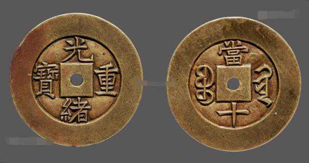 咸丰时期,因大钱的滥发,引起商民抵制,难以流通于市肆,是以清廷只得保留当十一种大钱,此后对外虽仍行用小平制钱,然京城则主要行使当十大钱。二十余年习以为常,故至光绪初年,京局铸钱之始,即先铸行的光绪当十大钱。后因银价日昂,银一两可易当十钱六七百枚,光绪当十钱旋即停铸。