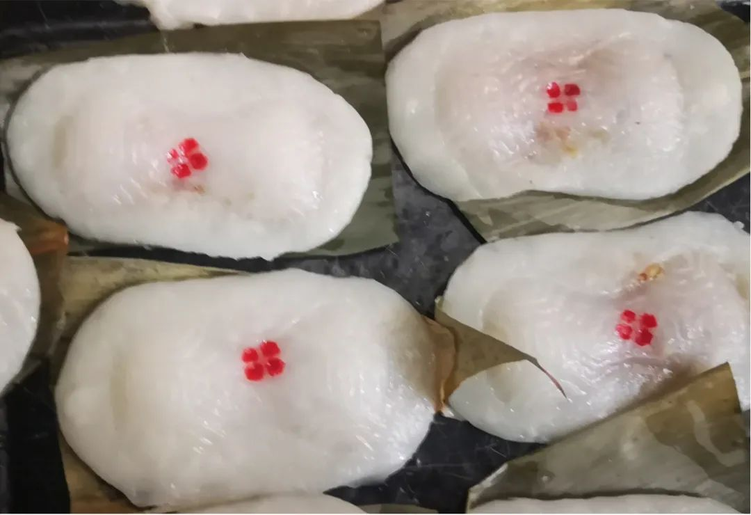 宋·《东京梦华录》记载:“七夕以油面糖蜜,作为压笑儿,谓之‘果食’。”这就是糖粿最早的来历。将糯米粉加水揉成类似于汤圆的小圆球,有白色和红色两种,用手碾压使两面向内略凹,好似人脸上的笑靥(俗称“酒窝”),意思是祝愿织女在和牛郎相会时笑容满面、甜甜蜜蜜。将双色糖粿放入水中滾熟后捞起,撒上花生糖便可以吃了。