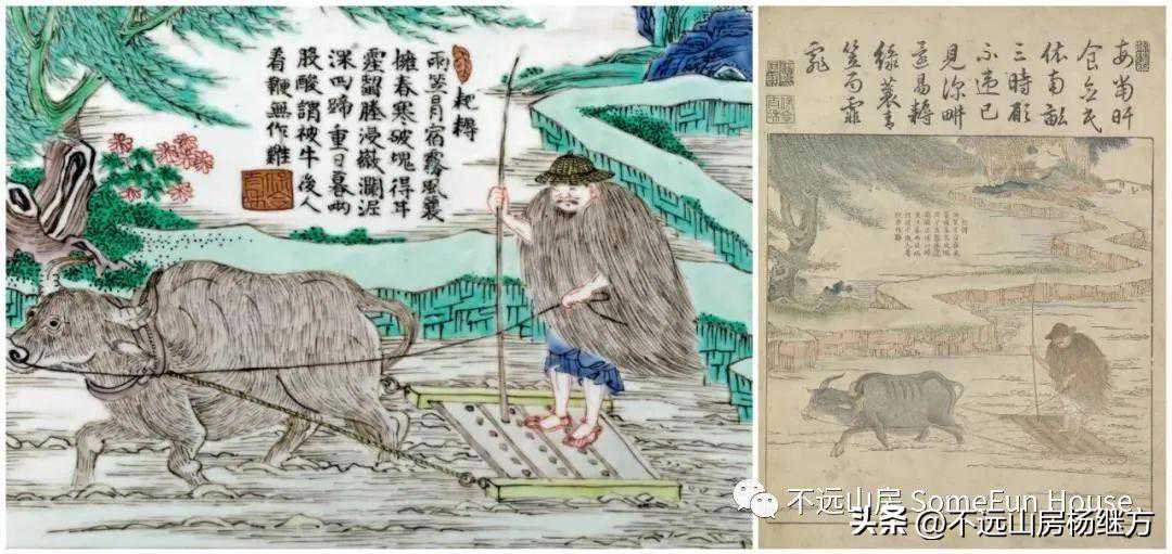康熙青花、五彩瓷绘中的人物题材,与当时的政治风气、社会生活有着密切的联系。如这时出现的耕织图、刀马人、渔家乐、渔樵耕读等都折射了当时社会的影像。
