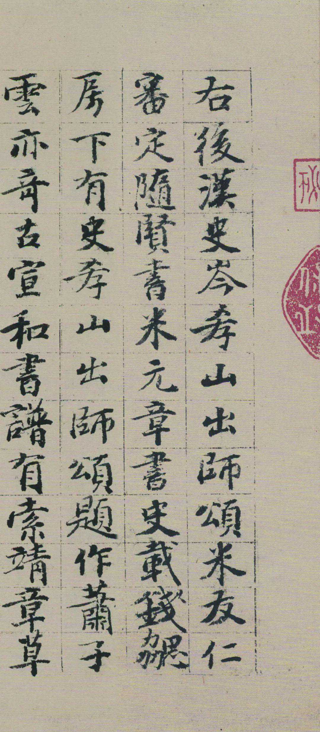 后纸宋米友仁跋:“右出师颂,隋贤书,绍兴九年四月七日,臣米友仁审定。”右下钤“监书画博士印”。左鉴藏印记6方,计有:“物”(半印)、“□轩”、“□□山牧”、“古希天子”、“寿”及一印文不辨印。右鉴藏印6方,为“安仪周家珍藏”、“五福五代堂宝”、“八徵耄念之宝”、“嘉庆御览之宝”、“宣统鉴赏”、“无逸斋精鉴玺”。