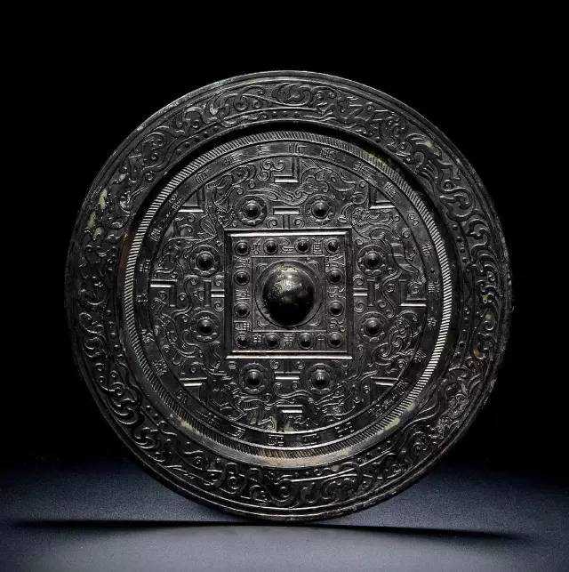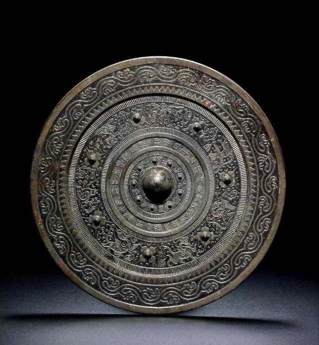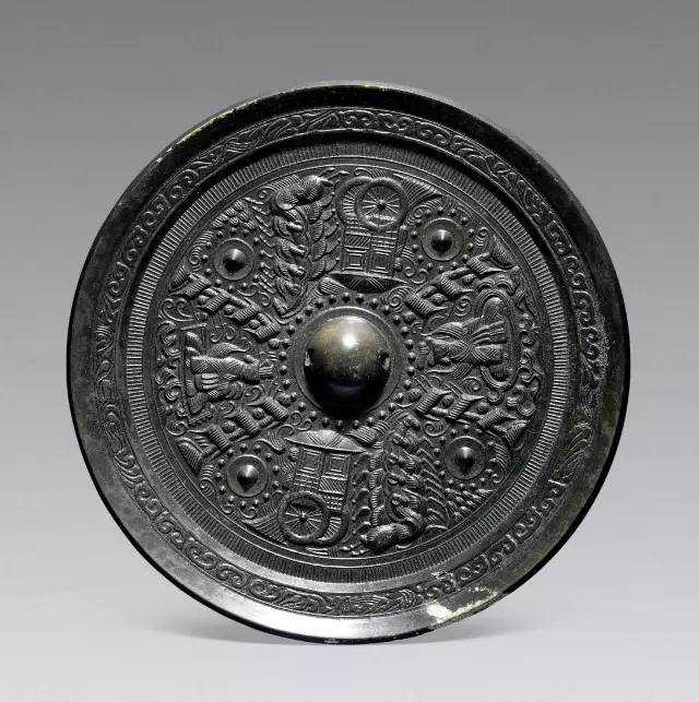 此镜通体光泽匀亮,包浆细润,乳丁扎手,保存完整,仅镜面有冲线,厚重。纹饰作高浮雕,东王公西王母位列镜背,正襟端坐,面容祥和,衣带飘举,背着霞光。两侧羽人俯首,场面庄严。十匹骏马载车飞驰,所过之处尘土飞扬,崇山峻岭一览无余。刻铸极精,神人面貌、羽人衣褶、奔马状态都一一细琢,无不生动形象。