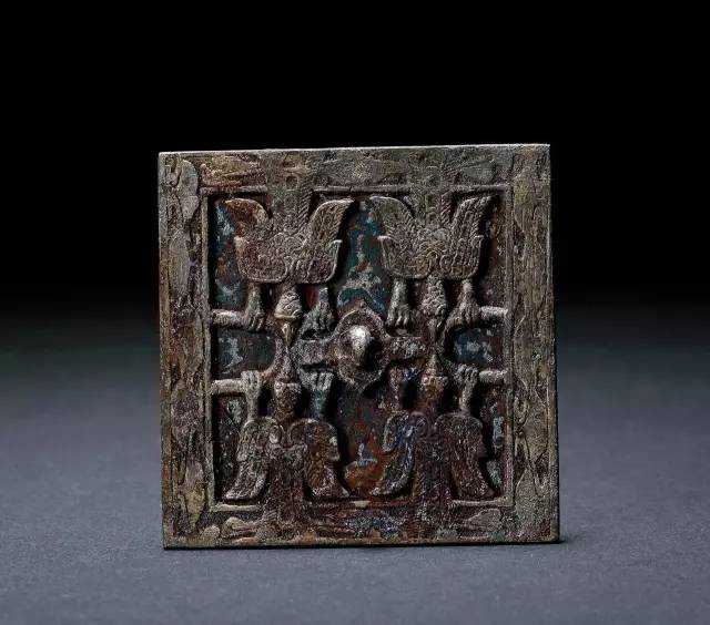 镜方形,保存完整,纹饰以四鸟对称排列,镂空制式,纹饰生动细致,鸟怒目巨爪,翎毛舒展,通体鳞片状羽,整体象形而成,极富生趣。此品种甚为稀有,版工如此犀利者甚少,日本收藏大家千石唯司存有一枚,为《中国青铜器全集》第十六卷封面,两者相较,此镜工艺及完整度皆胜。