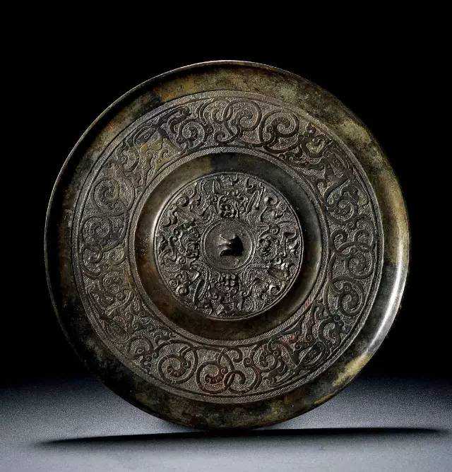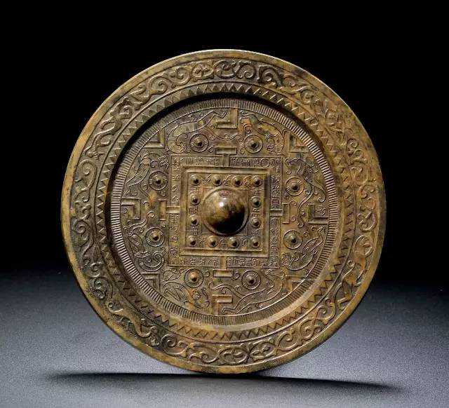 镜版工细致,尺寸较大,纹饰内容特殊,裂修。此镜三弦钮,以云雷纹为底纹。钮外有一周瑞兽纹饰,瑞兽身体屈曲盘绕似夔龙,而圆耳怒目似野兽,造型十分奇特,钮区外亦饰一周蟠螭纹,龙身盘绕交错,工艺甚为精美。