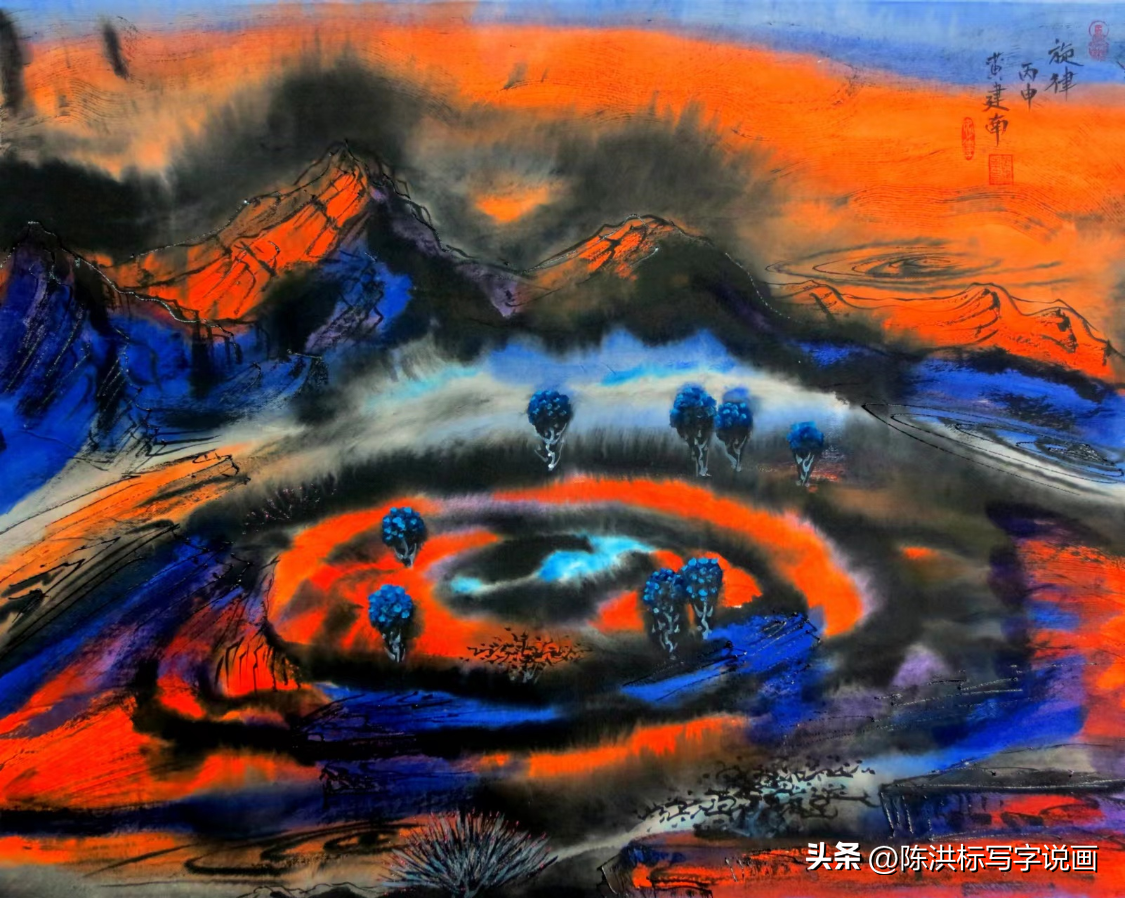 因为他在追求淡雅意境的传统中国水墨画中,加入了朝阳般火热的色彩,画面色感温暖,颜色斑斓,线条和用色都极为大胆。