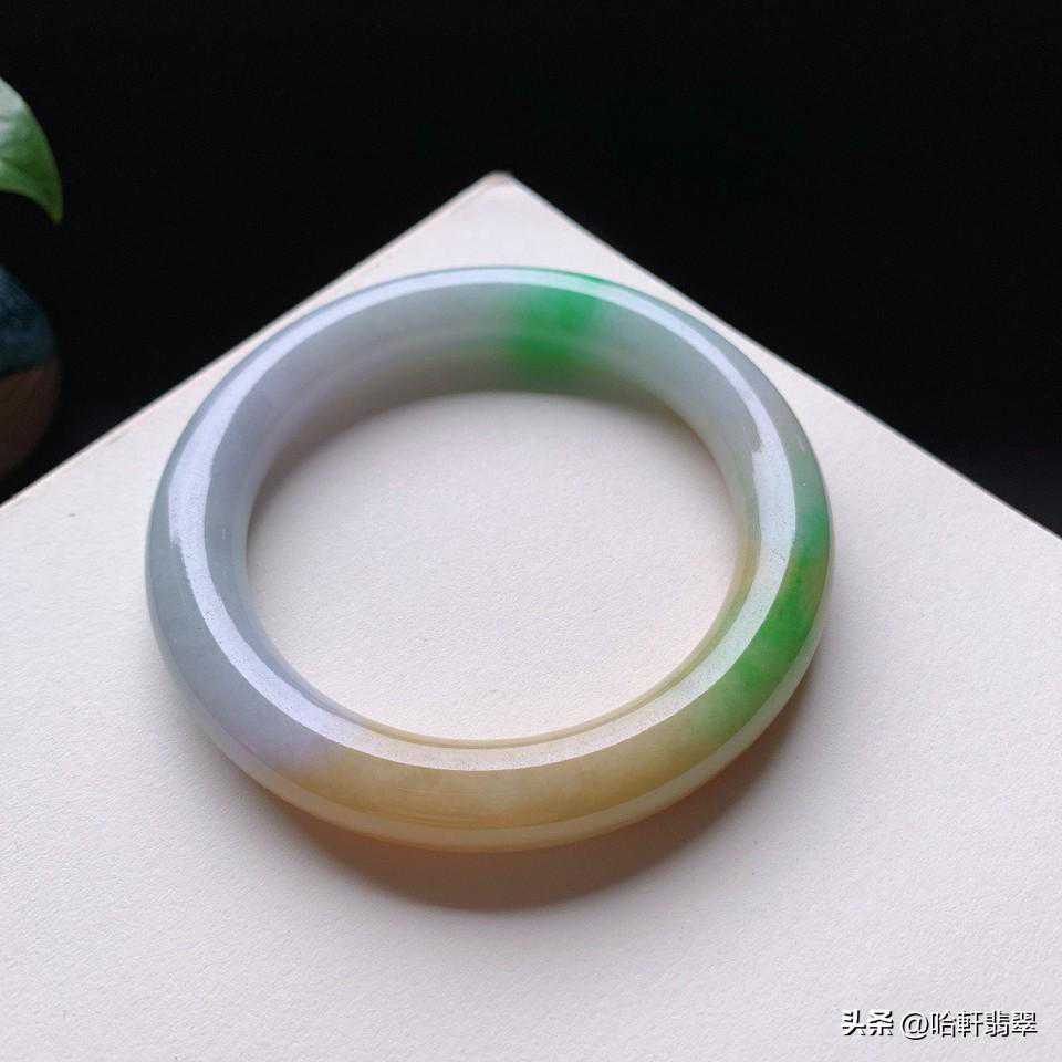 再比如上面这只细糯种三彩翡翠手镯,黄、紫、绿同时出现本身很少见稀有,但也不算是高端翡翠,价位跟上面那只手镯差不多。