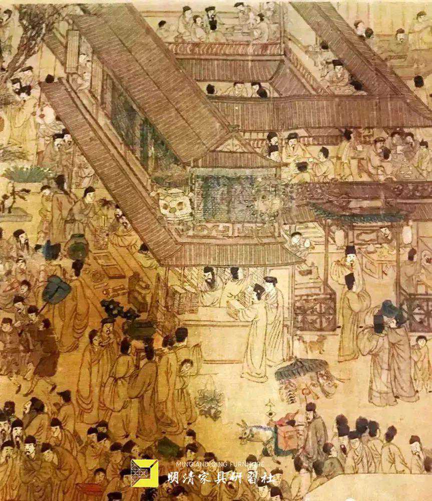 绘制于万历至天启年间,描绘南京上元节集市图景的《上元灯彩图》中甚至可以看到文玩市场上有不少销售家具的店铺和摊贩,其中已经包括架子床、罗汉床、几、案、桌、凳、箱、插屏、帽椅等等。