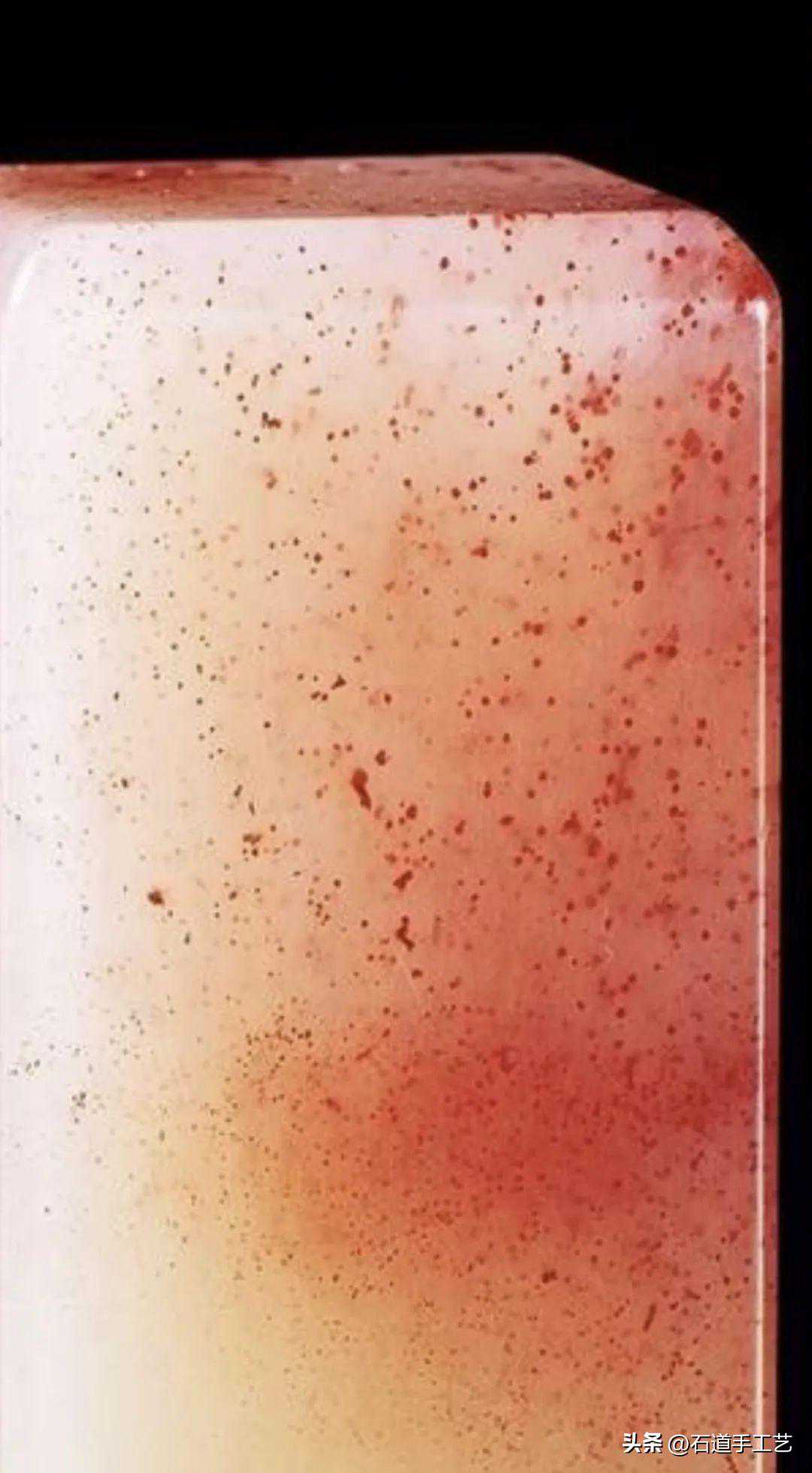 古籍之言于现代人来说有些晦涩难懂。沈兴总结说道,桃花冻,旧录称“桃花水”“浪滚桃花”。白而通明的水坑冻石中含有鲜红色细点,似桃花洒落于清水中,故名。红白对比,点点分明,十分惹人喜爱。其实它还与朱砂红同质而异类,只是更加妩媚娇艳。《后观石录》将桃花冻称为“桃花水”或“浪滚桃花”,实在是恰当之至。