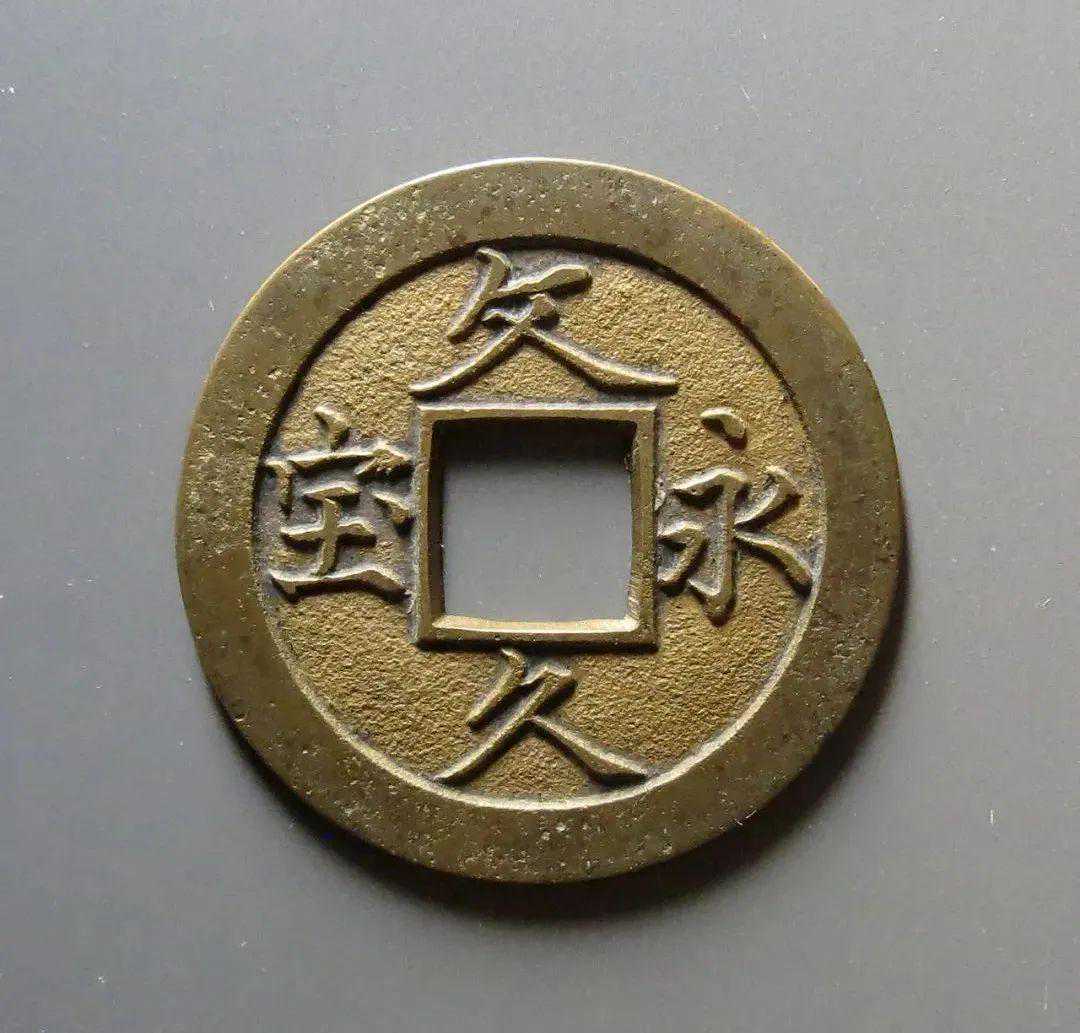因此,到了至平安朝时,由于和宋朝贸易频繁,宋钱大量流入日本市场,再加上自身铸造钱币质量低劣,在社会上所以宋钱受到民间喜爱。日本政府在屡次颁发禁令无效后,也承认了宋钱流通的合法性。直到万历二十四年(日本后阳成天皇庆长元年)日本才再次自铸货币,铸造了庆长通宝钱。这次自铸货币,也完全模仿中国,仅仅是将唐朝的开元通宝钱改成了明朝的永乐通宝钱而已。(图五)