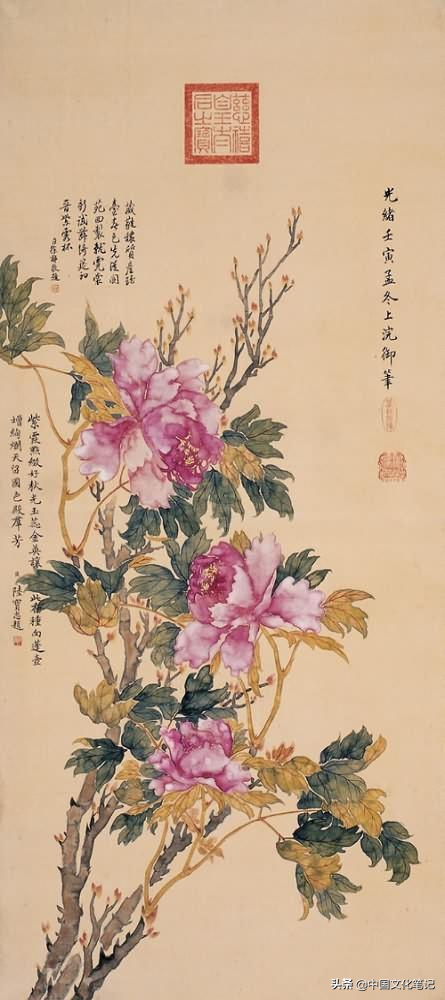 就我以为,那些盖有慈禧大印的书画作品,大部分是按照“慈禧指示、缪素筠创作”的方法绘制出来的。晚清的夏仁虎曾说,“内廷如意馆画工皆是苏州人,光绪间昆明缪素筠女史嘉惠工花卉,承旨二十余年。每当拈毫染翰,孝钦皇后并坐指示之,眷遇始终不衰。”所以慈禧太后只是“并坐指示之”,待画好之后,钤上自己的印章即可。
