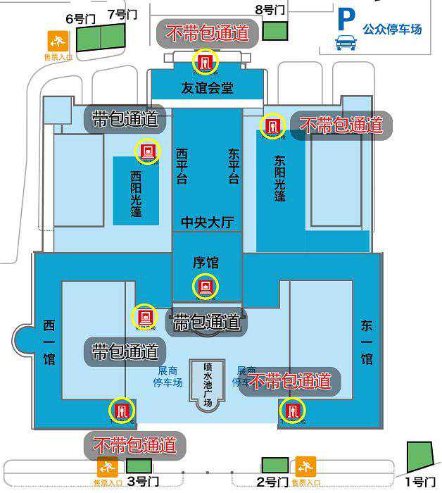 如从延安中路进展览中心,不带包的朋友可以从东一馆、西一馆两侧的安检口直接入场;带包的朋友需穿过喷水池广场从序馆、西一馆内侧的“带包通道”口入场。
