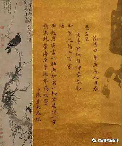 参与重华宫茶宴联句的王际华记录了乾隆三十五年和乾隆三十九年收到的礼物。乾隆三十五年,“赐葱玉如意一柄,沈石田《冷泉亭图》一轴,文徵明《溪亭对话》一轴。皆有”。而在乾隆三十九年,则是“赐旧玉如意一柄,歙砚一方,董祥《瓶兰》一轴,居节《山水》一轴。皆有”。不仅如意、砚台和画轴齐备,与宴大臣“皆有”,而且画轴有两件。正是在乾隆三十九年的茶宴上,张若溎获得了乾隆赐下的唐寅《古槎鸲鹆图》,但奇怪的是张若溎只记录下这一件作品。一种可能是乾隆赐画本身就有多寡之别,有人两轴,有人一轴;更可能的情况是,张若溎也收到两件作品,只是因为在唐寅画上题记,就把另一件忽略了。