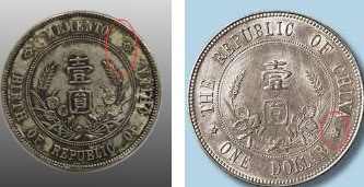 【一】下五角星版:银元正面中央镌孙中山侧面肖像,外围双圈(内一线圈,外珠点圈),边缘上镌中文隶书体“中华民国”4字,下镌中文隶书体“开国纪念币”5字,左右长枝花饰。背面中央竖镌中文隶书体“壹圆”及嘉禾;外围双圈(内一线圈,外珠点圈),边缘上镌英文“THEREPUBLICOFCHINA”(中华民国),下镌英文“ONEDOLLAR”(壹元),左右下方分列五角星。