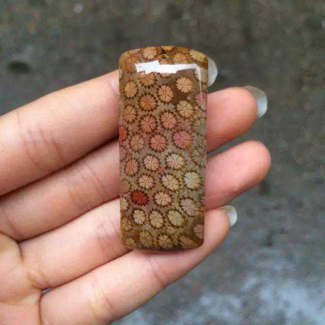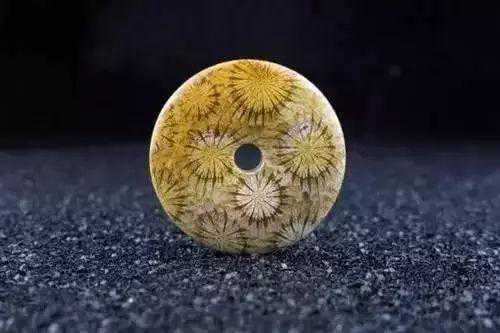 珊瑚玉化石,是一种经历了数亿年的地壳运动和高温高压环境才形成的化石玉。因其外观、花纹鲜亮明显很像菊花,所以玉石专家也称之为“菊花玉”,别名“发财玉”。在国际上,人们也将某些呈“玉髓化现象”(呈半透明状,硬度为6—7度)的珊瑚玉,归为“有机宝石”一类。