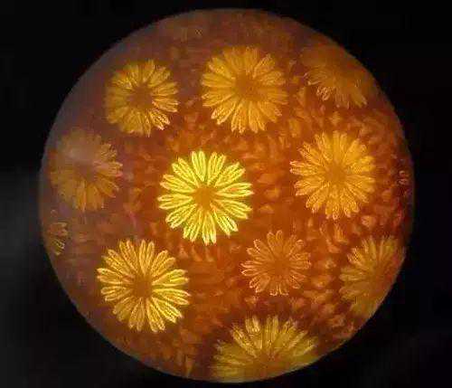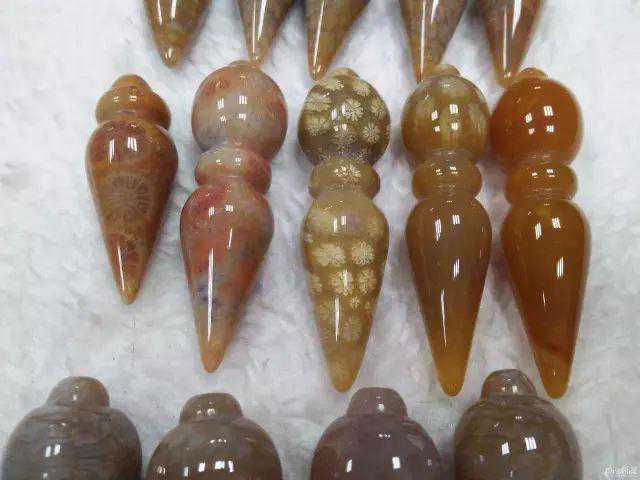 珊瑚玉的花纹会因为珊瑚的大小、种类不同,而形成不同的花纹图案,或呈放射状、或呈卷纹状。此外,由于组成玉化矿物的物质成分通常是不同的,所以珊瑚玉也会相应的呈现出不同的颜色。其中花型花瓣清晰、排列紧密,就好像一片菊花海洋的菊花化石,更是不可多得的收藏级珍品。