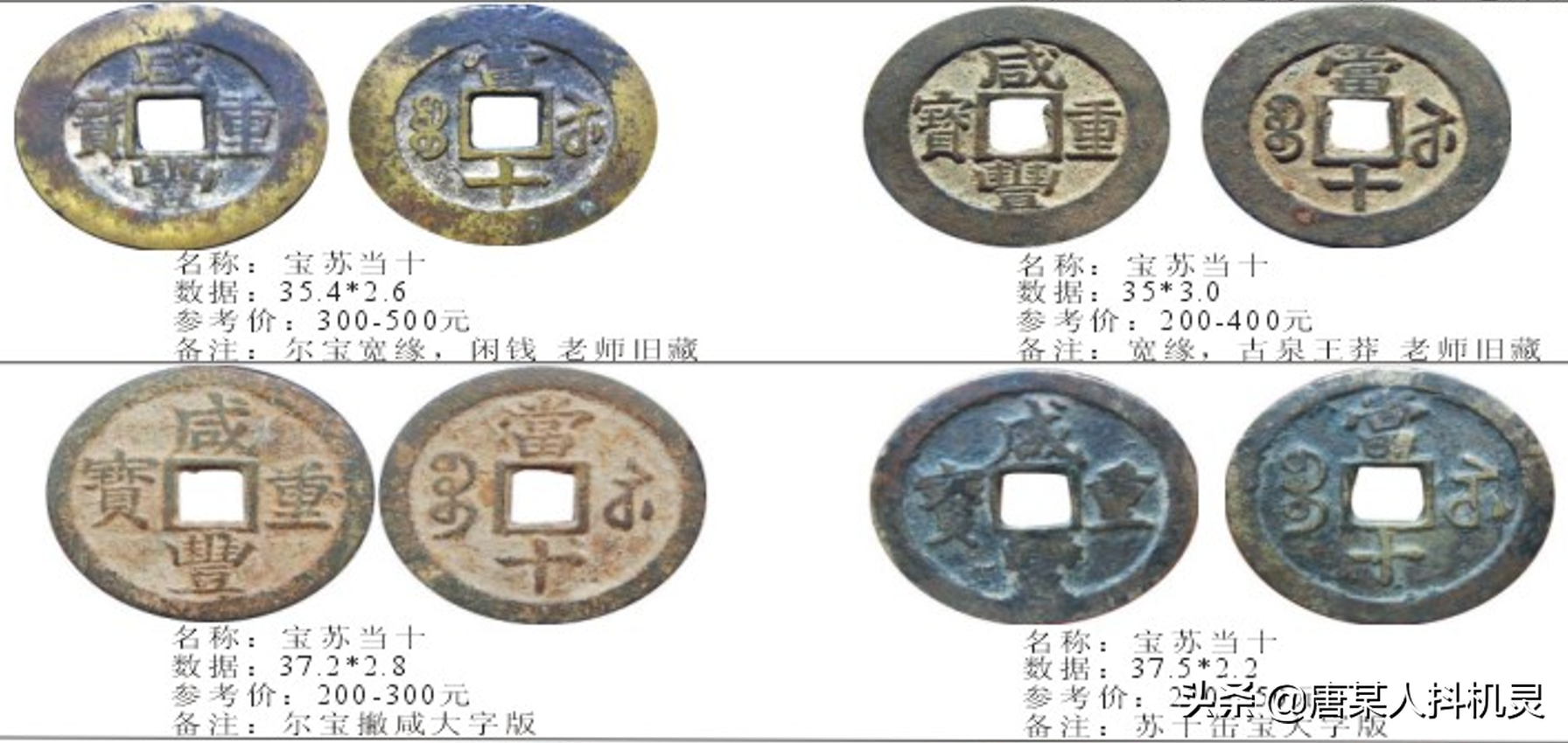 宝苏局,江苏省局铸,铸造量大所以存世量较多,版本在咸丰钱中最为多样,有见小平、当十、当二十、当三十、当五十、当百和当千多个等地。
