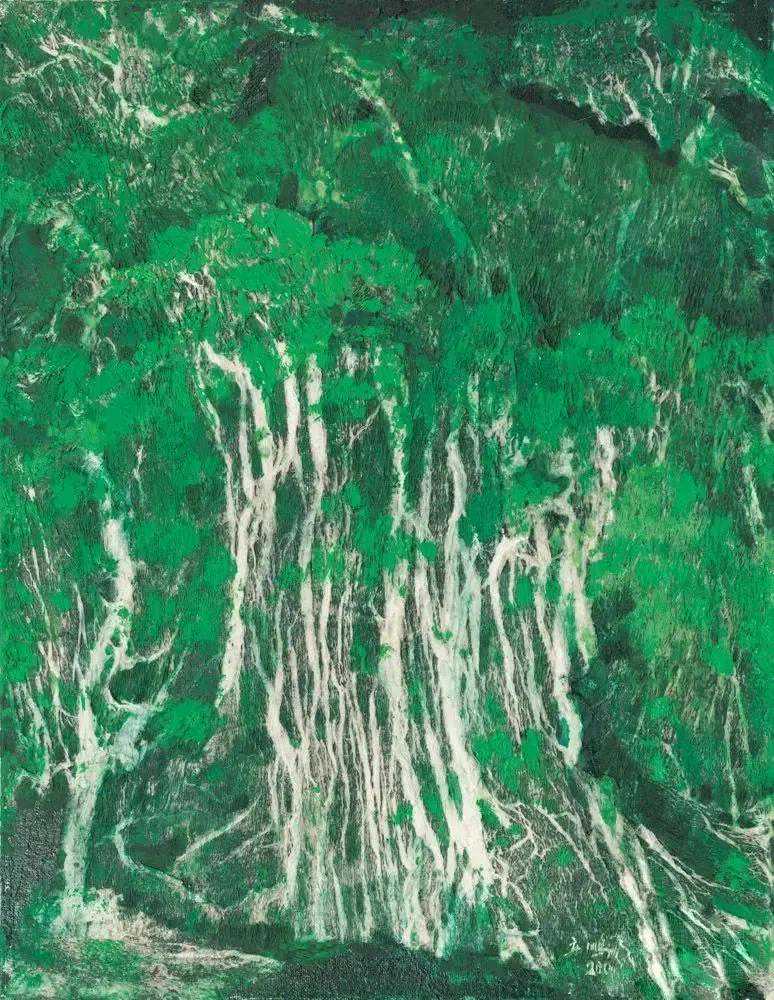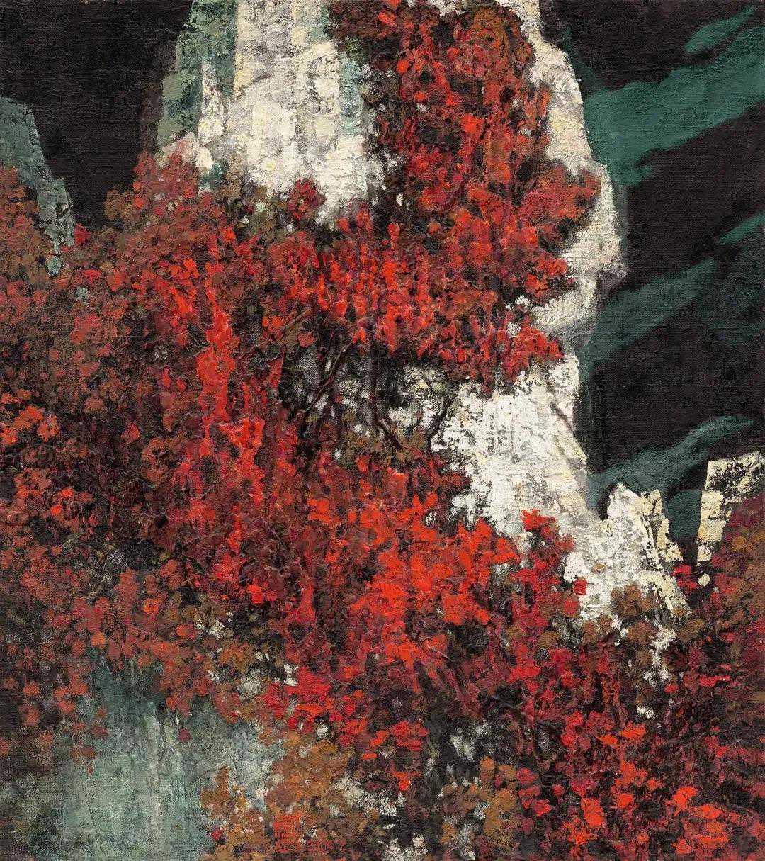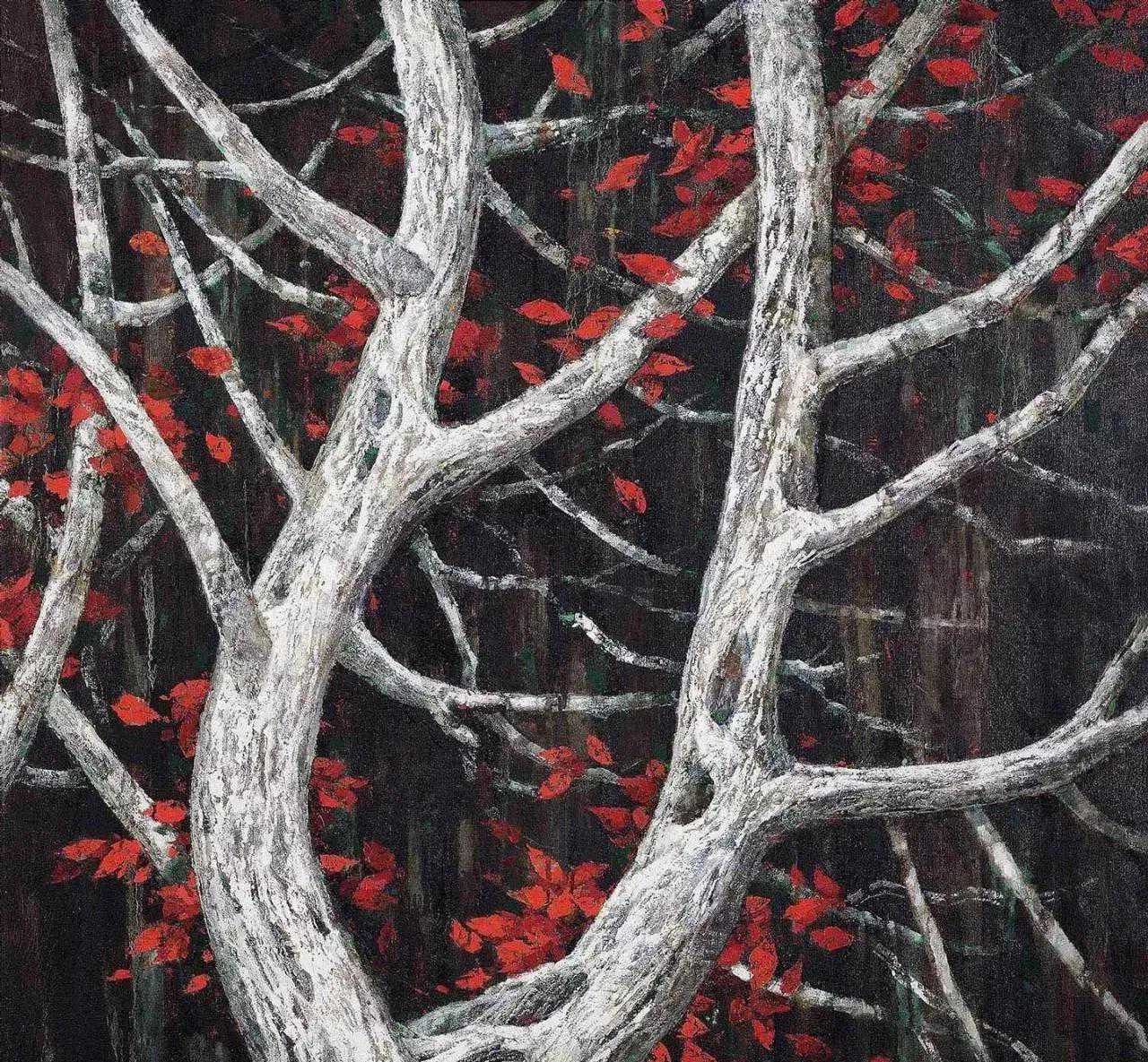 放眼当今画坛,闻先生无疑是具有鲜明个性的,尤其是他由红烛精神发展出的红色更是他的鲜明风格。他的画中如铁铸的造型与线条充满了力量感,那些遒劲有力的松柏便是国之脊梁,那如鲜血的红便是父辈的革命精神。