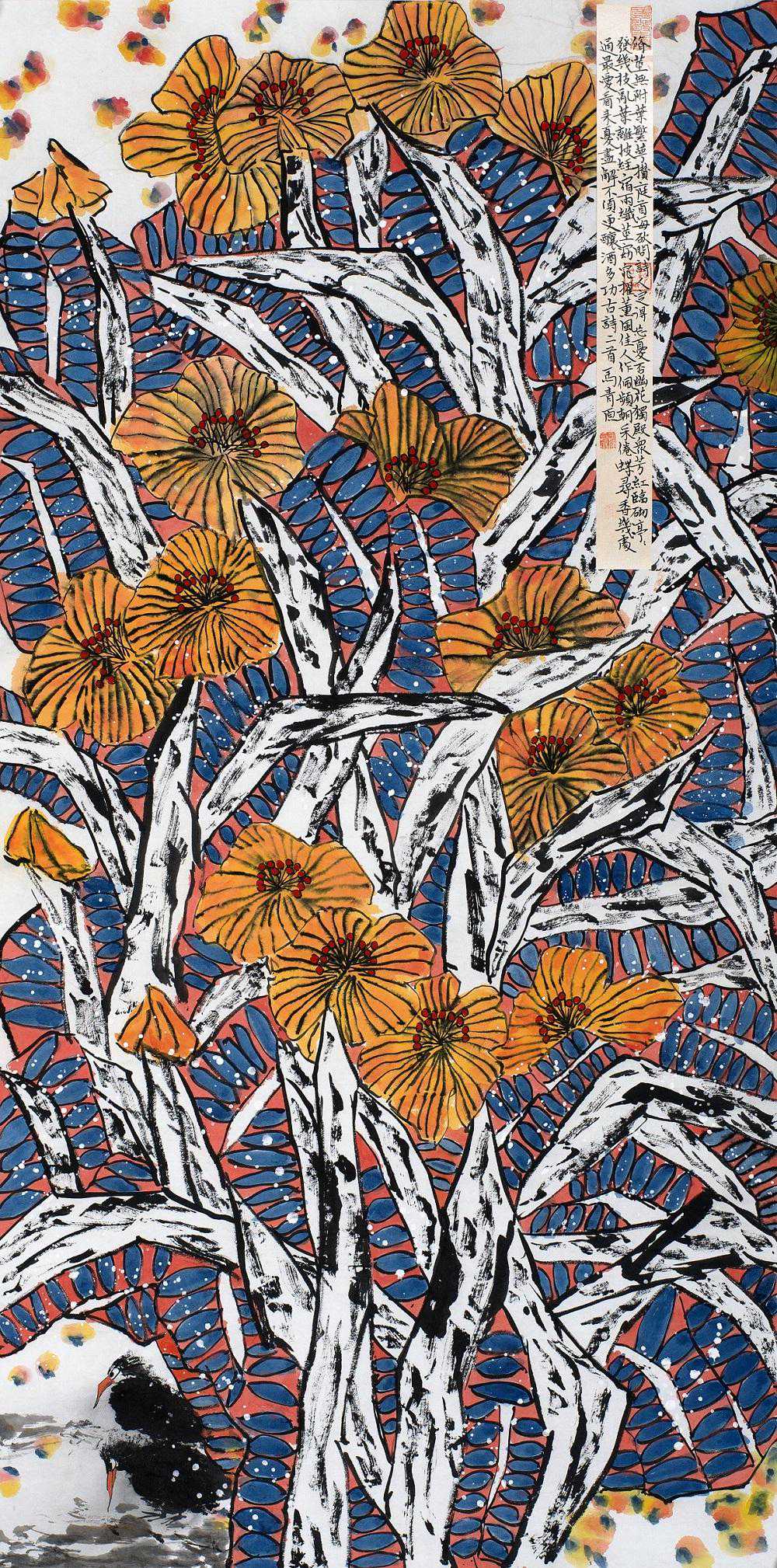 马青原的花鸟画与传统花鸟画的最明显区别在于,她常常舍弃传统绘画中折枝花或者全枝花的藤枝(偶尔也画粗壮的树干),独留花与叶。换句话说,就是变线性结构为块面结构,形成满幅构图。通过比较我们可以发现,传统折枝花或者全枝花有比较固化的构图模式,比如常见的Y字形、V字形、X字形、C字形等,讲究计白当黑,计虚当实,讲究虚灵和韵致。而马青原的花鸟画完全颠覆了传统,她常常舍弃花卉的藤枝,以花朵和叶子构成几乎满幅的色彩块面,给人以厚重、沉实、博大之感。(节选)