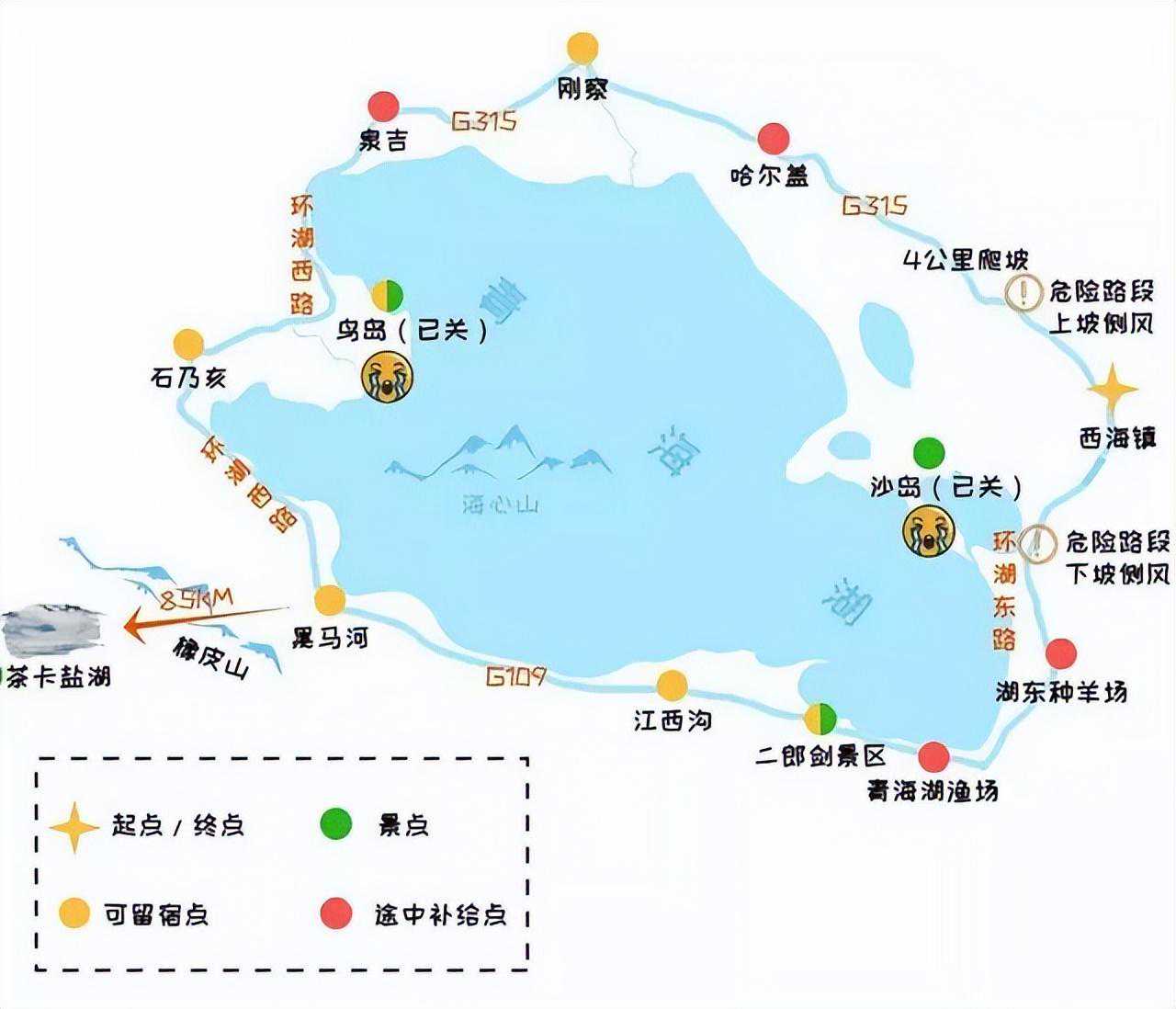 环青海湖骑行的公路由北边的315国道、南边的109国道和东、西两边的环湖东路及环湖西路组成,总里程大约为360公里。绝大多数环湖骑行都分四天完成,而且最佳出发点和终点一般在西海镇,中间在江西沟、黑马河与刚察过夜。下面以这四个大节点为重点来介绍行程。除了四日环湖外,按照以下所列节点,可以排列出N天的骑行环湖方案: