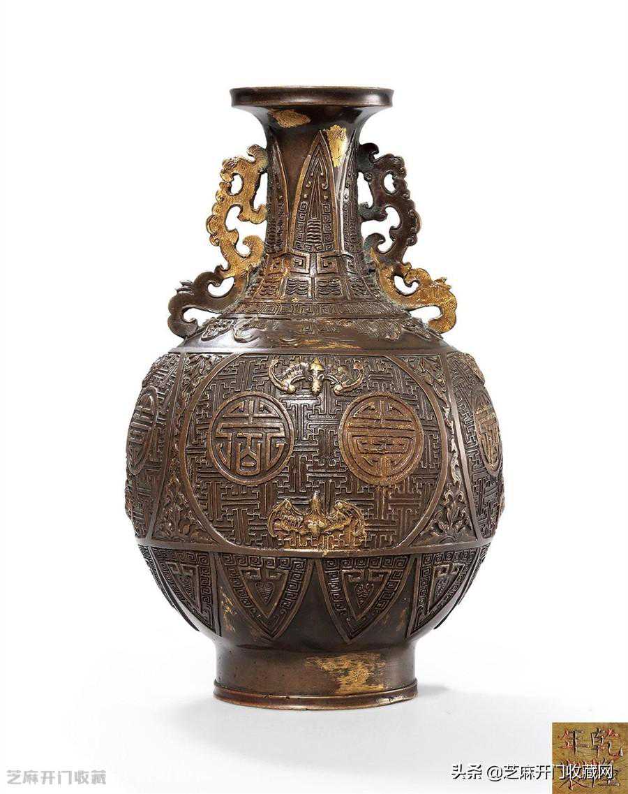 3:清乾隆铜局部鎏金螭龙耳福寿瓶,尺寸:高17.7厘米,估价:RMB900,000~1,200,000,成交价:RMB1,495,000