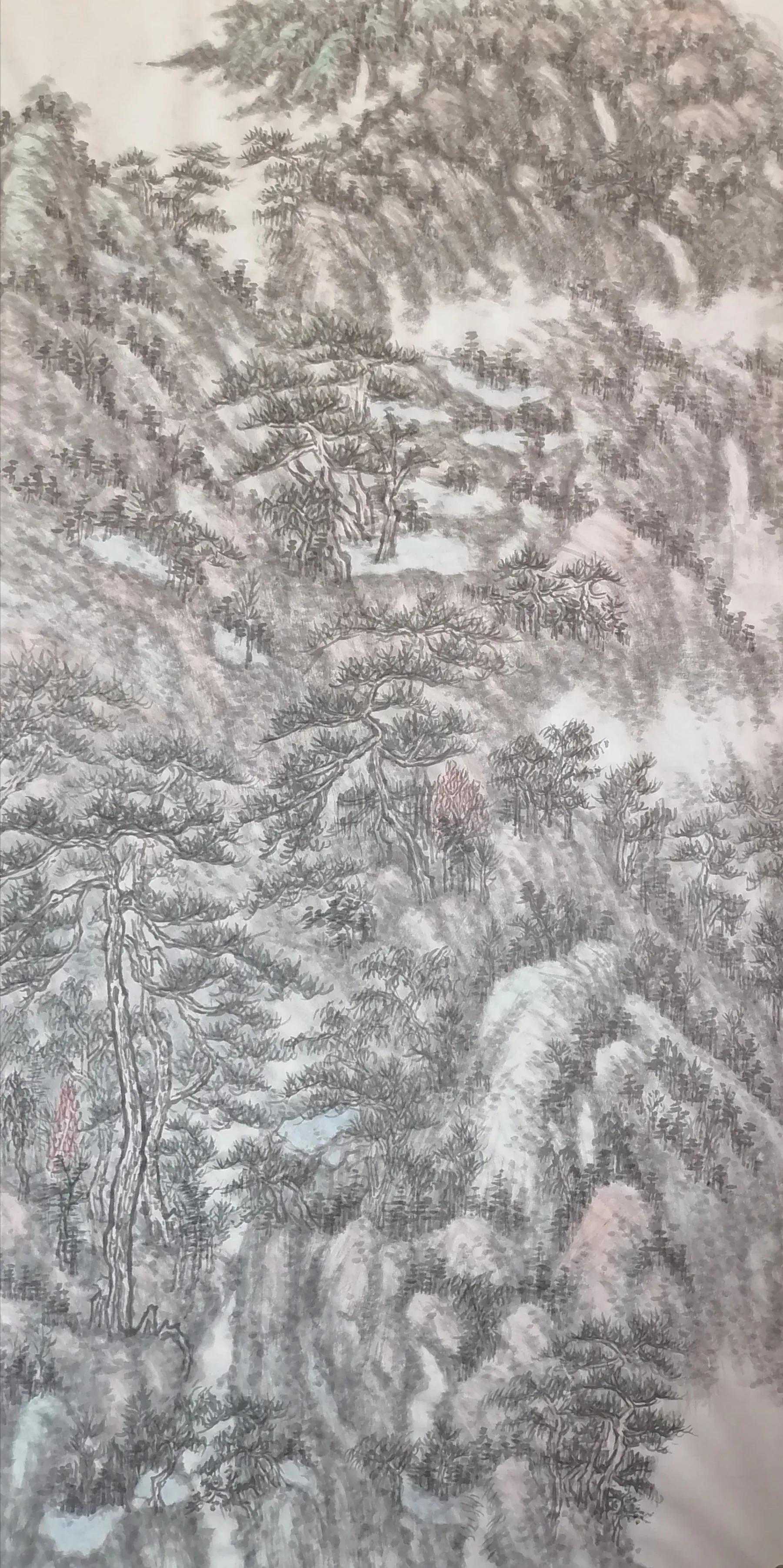 昨晚,我在墨稿的基础上涂颜色。我的山水画以颜色分类叫“浅降山水”。什么意思呢?就是以墨为主,用色辅之。简言之,目的也是为了“好看”。